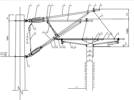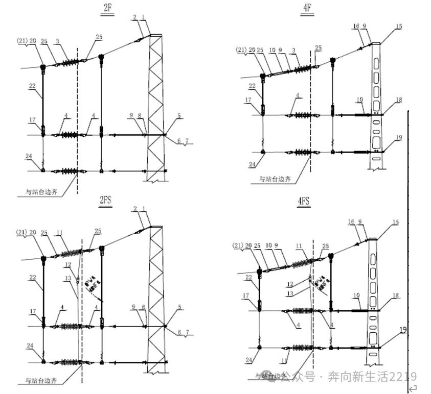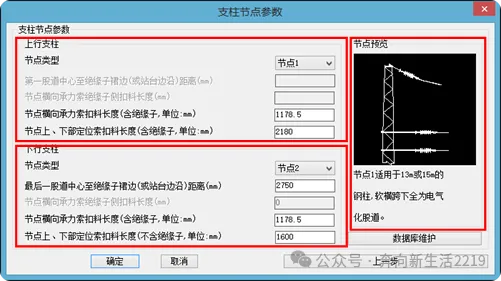 支柱节点(J2、J4、J2T、J4T、J2S、J4S、J2TS、J4TS、J2F、J4F、J2FS、J4FS、J2TF、J4TF、J2TFS、J4TFS)靠近站台侧绝缘子(下图3或下图11等),包含绝缘子和两个70型双耳楔形线夹,在维护数据库之后,计算结果包含1个绝缘子(硅胶、悬式瓷瓶4片、悬式瓷瓶3片)和2个70型双耳楔形线夹的长度。