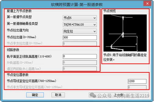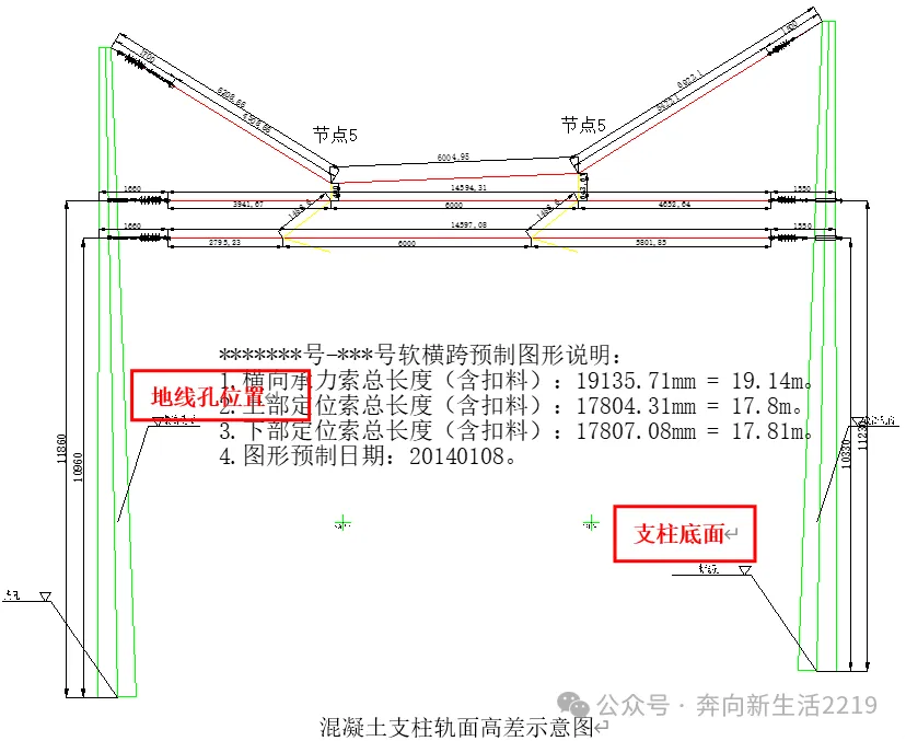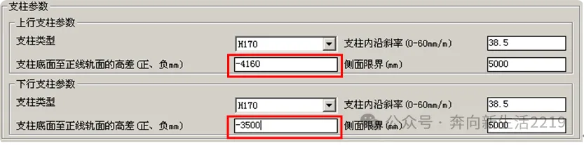 软件基于坐标原理计算,所有参数皆相对于正线轨面、支柱轨面红线等计算。如软横跨支柱为钢柱,则需要标明钢柱基础面至轨面高差(高于轨面为正,低于轨面为负数)。如软横跨支柱为混凝土支柱,由于数据库中维护的是完整的支柱尺寸,而实际混凝土支柱包含3-3.5米埋深。因此输入参数时要考虑混柱埋入地下部分。(以H170/(12+3.5)为例,如地线孔低于轨面660mm,则支柱底面至正线轨面的高差=-[660mm(轨面红线位置)+3500(埋深)mm]=-4160)。如地线孔高于轨面660mm,则支柱底面至正线轨面的高差= [660mm(轨面红线位置)-3500(埋深)mm]=-2840)