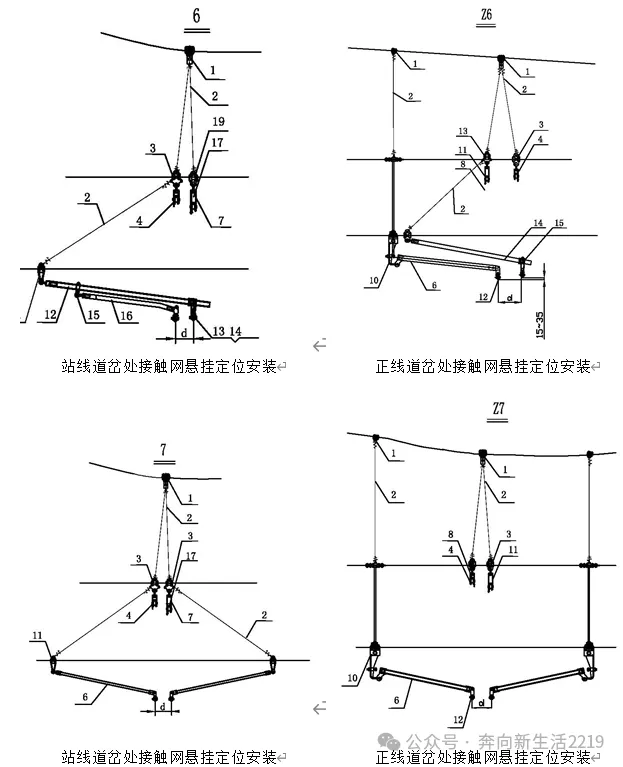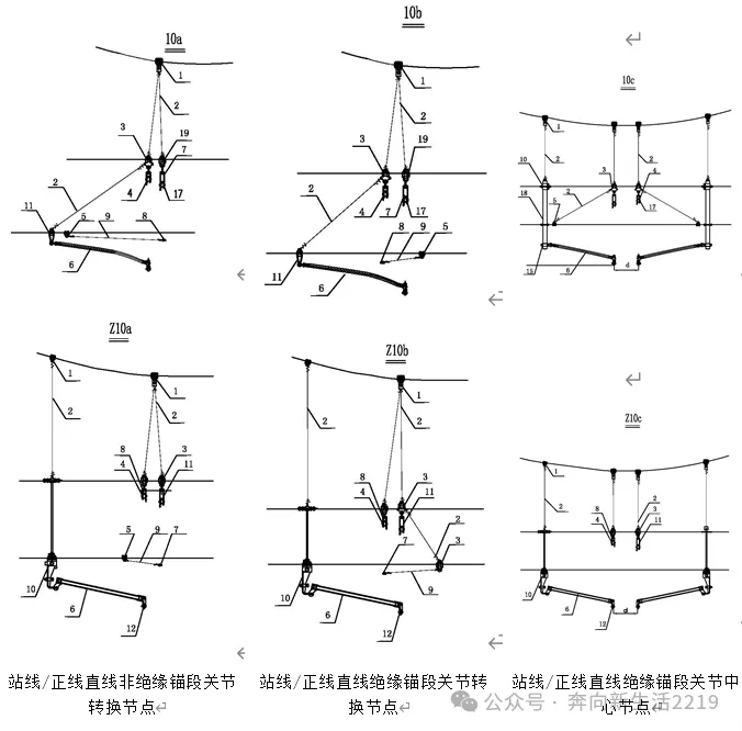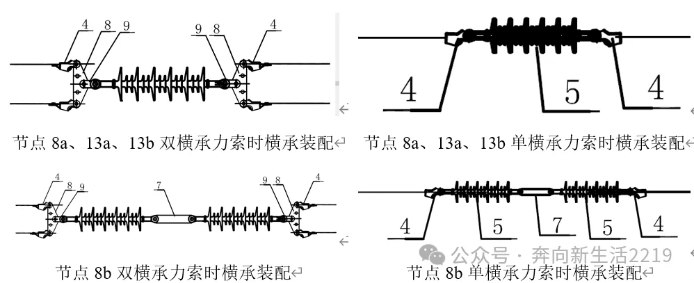 股道之间节点(8a、8b、9a、9b、13a、13b)双横承力索时,横向承力索包含绝缘子(硅胶、悬式瓷瓶4片或悬式瓷瓶3片),z-7型挂板(下图9),LV-0712型连板(下图8)、70型双耳楔形线夹(下图4)组成。