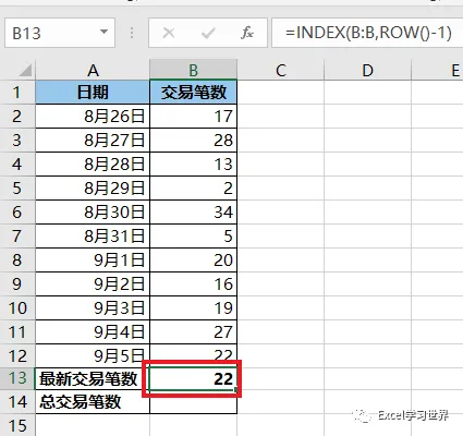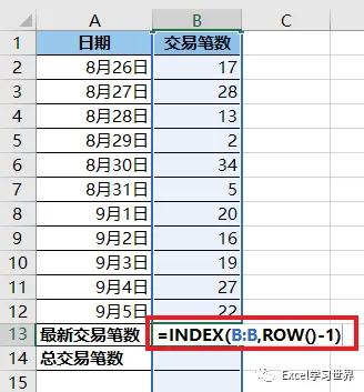 这里的公式表示从 B 列中提取出当前行的上一行 ROW()-1