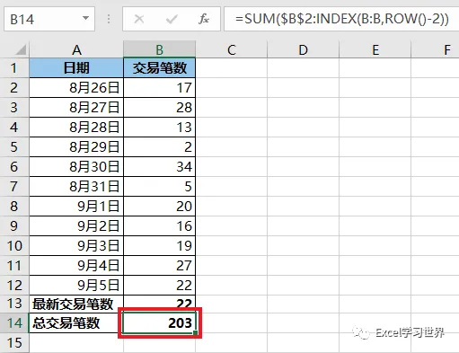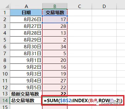 学会了上一个公式,这里就比较好理解了,sum 函数的起始区域固定在 B2 单元格,而截止区域始终是当前行的上两行