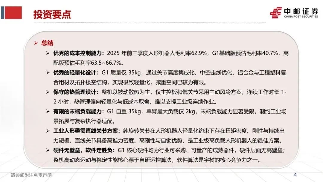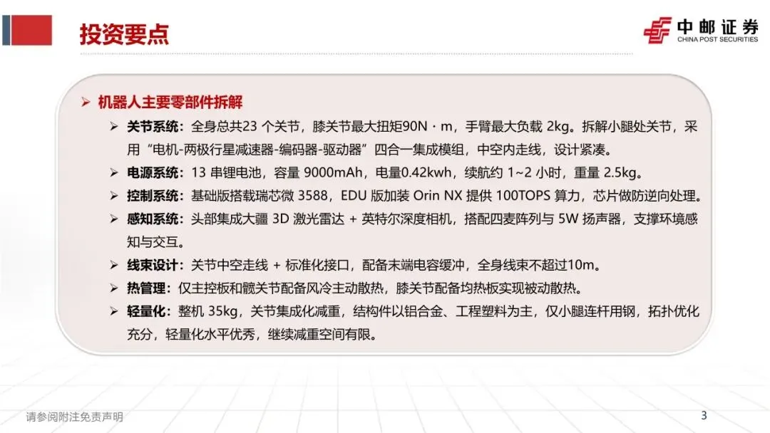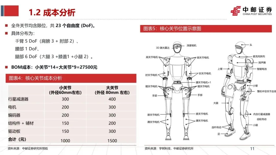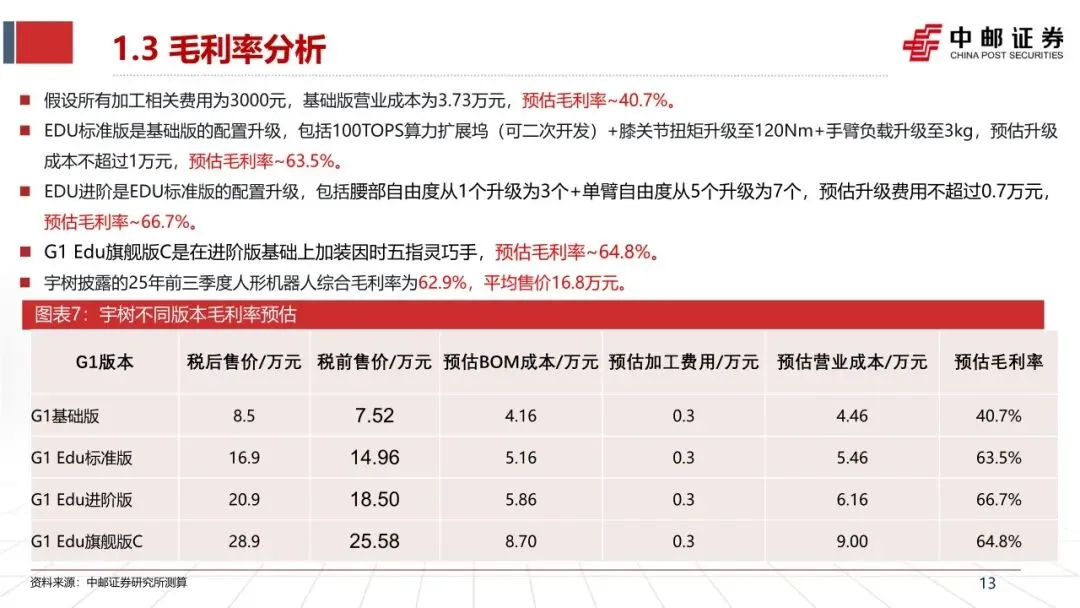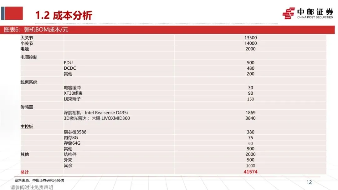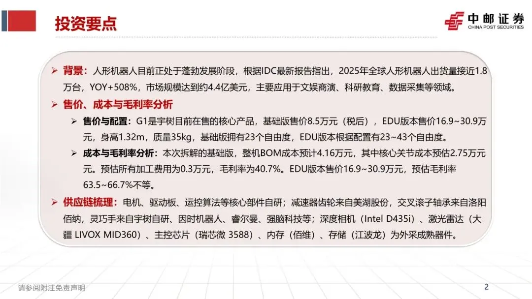 ➢ 成本与毛利率分析:本次拆解的基础版,整机BOM成本预计4.16万元,其中核心关节成本预估2.75万元元。预估所有加工费用为0.3万元,毛利率为40.7%。EDU版本售价16.9~30.9万元,预估毛利率63.5~66.7%不等。