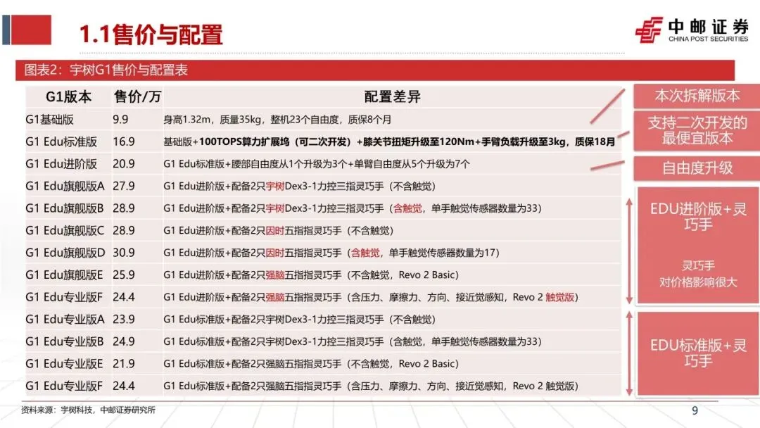 ➢ 售价与配置:G1是宇树目前在售的核心产品,基础版售价8.5万元(税后),EDU版本售价16.9~30.9万元,身高1.32m,质量35kg,基础版拥有23个自由度,EDU版本根据配置有23~43个自由度。