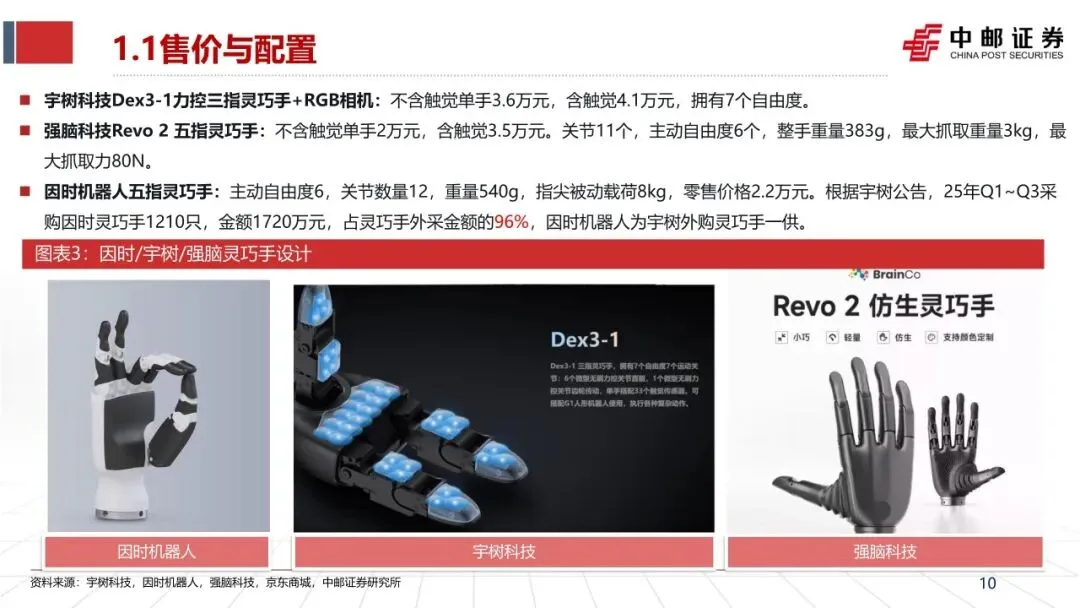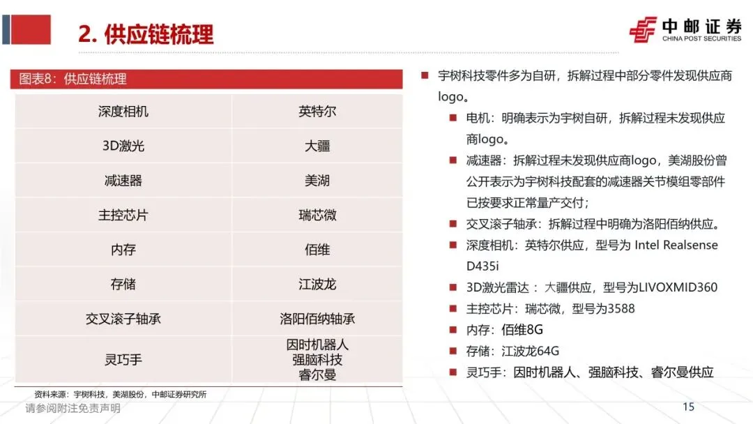 ➢ 供应链梳理:电机、驱动板、运控算法等核心部件自研;减速器齿轮来自美湖股份,交叉滚子轴承来自洛阳佰纳,灵巧手来自宇树自研、因时机器人、睿尔曼、强脑科技等;深度相机(Intel D435i)、激光雷达(大疆 LIVOX MID360)、主控芯片(瑞芯微3588)、内存(佰维)、存储(江波龙)为外采成熟器件。