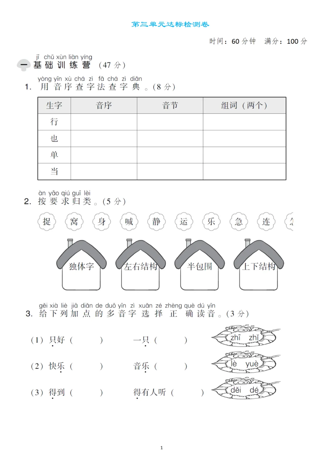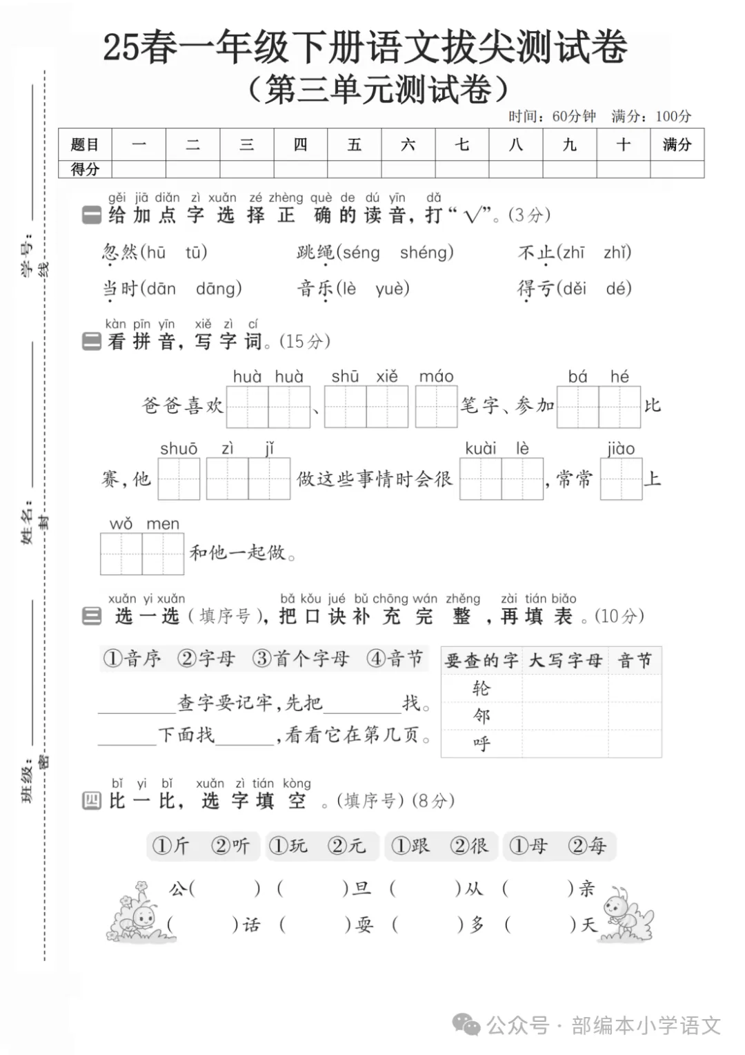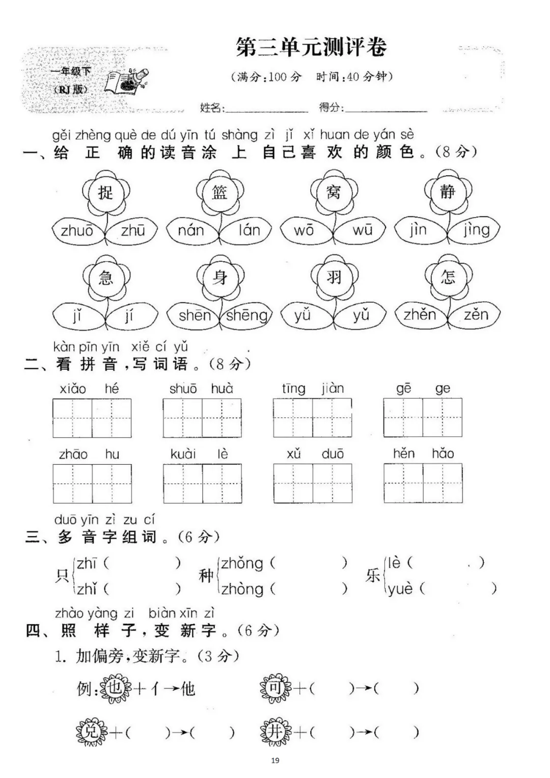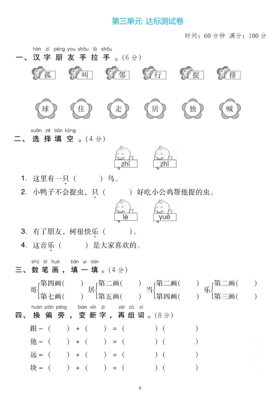 一年级下册第三单元检测卷6套,免费下载