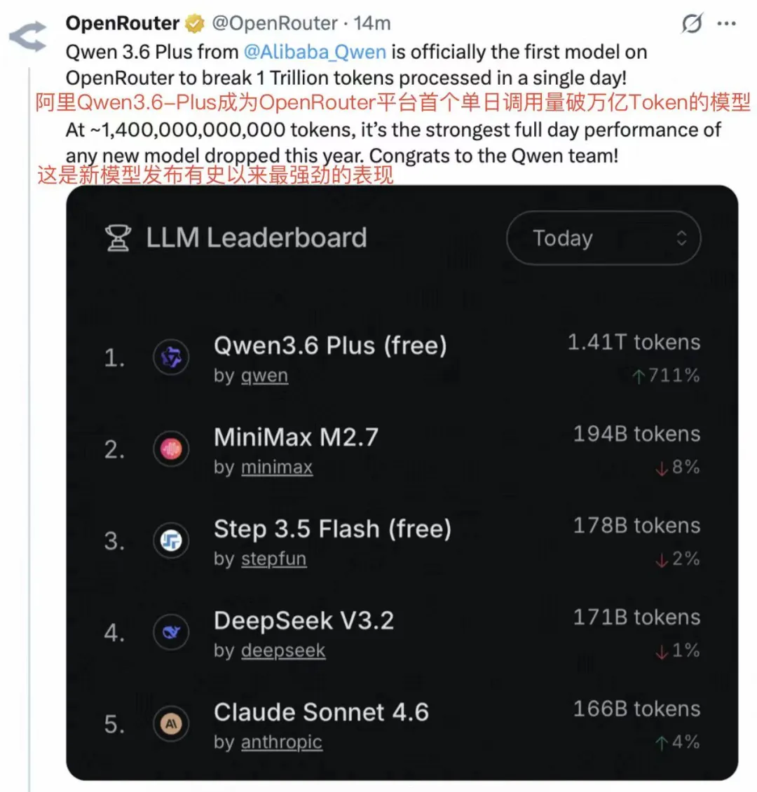 千问是这个趋势里的重要一环。前天千问3.6-Plus上线OpenRouter,当晚调用量激增711%,单日突破1.4万亿Token,登顶日榜,打破全球纪录。OpenRouter官方说这是”最强劲的新模型表现”。