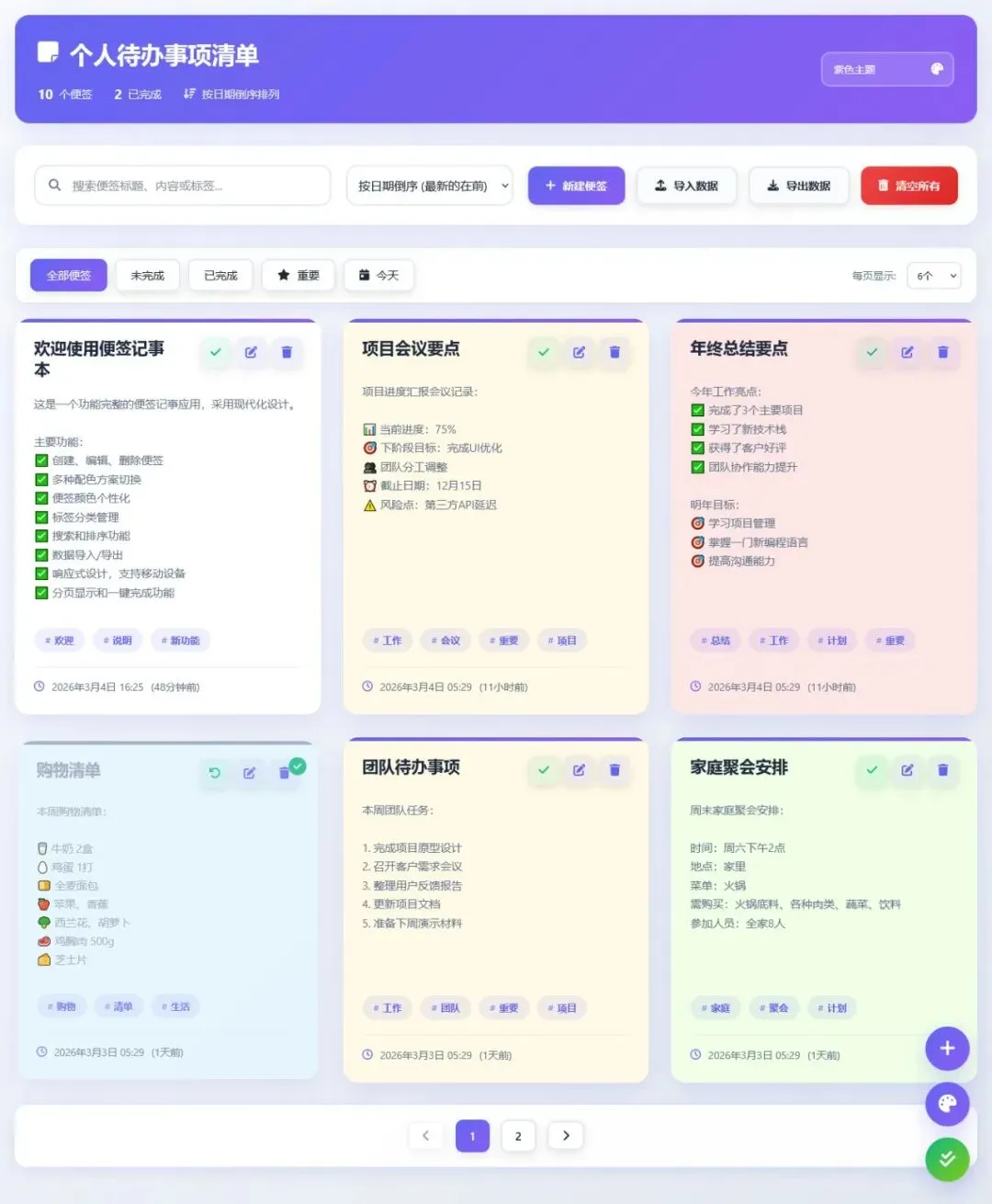 本款安卓APP非常实用,内置15种主题配色(8种主流色+7种混合色),支持导出便签数据(json格式),支持导入便签数据(复制粘贴),支持一键切换主题配色,支持一键完成便签功能,支持一键清空便签内容,支持多种便签排序方式,支持搜索便签标题、内容和标签(即写即搜),支持便签背景色个性化,等等。本款安卓APP是纯本地化应用,无需注册无需登录,完全在本地设备操作(无需联网)。