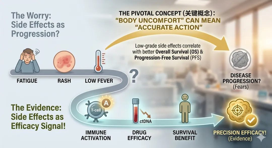 (图片清晰地展示了两种截然不同的‘体感逻辑’。左侧是你直觉里的恐慌:乏力、皮疹让你担心疾病进展;而右侧则是循证医学告诉我们的真相:轻中度副作用,往往是免疫大军被成功唤醒、精准攻击肿瘤的‘捷报’。如果你正处于灰色区,请看向金色区,这就是策略带来的力量。)