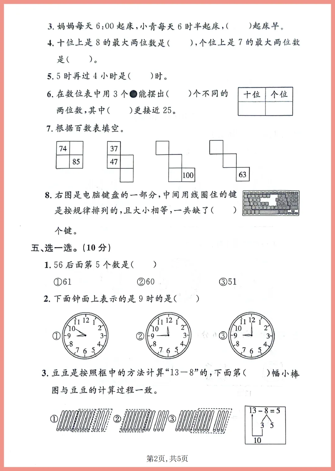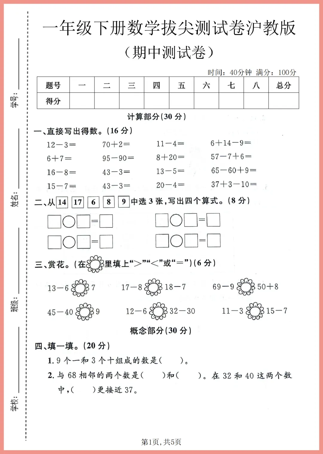 各位家长看过来!这份 2024 年沪教版一年级下册数学期中拔尖测试卷来啦,共 5 页精编内容。试卷紧扣教材重点,涵盖前半学期核心考点,题型丰富且难度适中,专为帮助孩子查漏补缺、提升解题思维设计。通过实战演练,孩子能熟悉考试节奏,轻松攻克易错难点,建立满满自信。机会难得,需要的家长赶紧下载打印,让孩子趁热打铁练一练,期中冲刺拿高分吧!