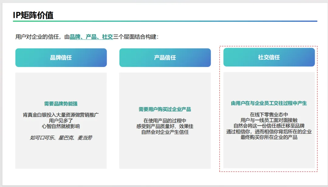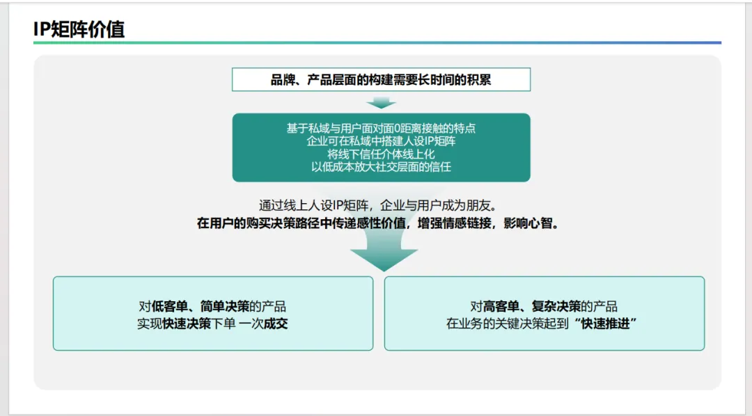 IP矩阵价值:阐述在私域中搭建人设IP矩阵的核心价值,即通过线上化、低成本地放大社交信任,影响用户心智和购买决策。