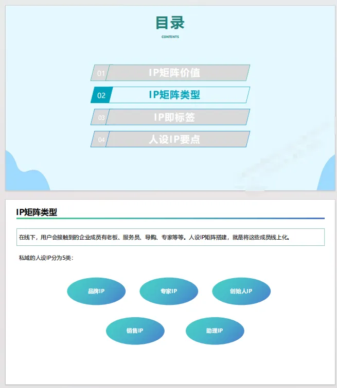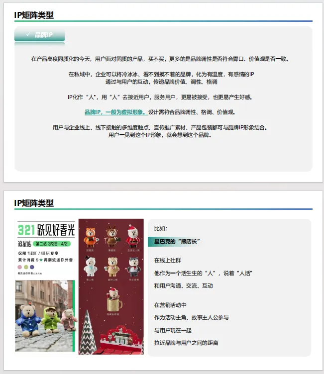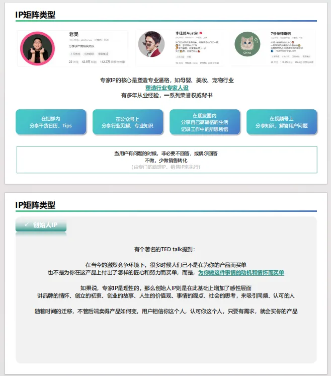 IP矩阵类型:详细介绍了私域中常见的五类人设IP:品牌IP、专家IP、创始人IP、助理IP和销售IP,并说明了各自的特点、作用和运营方式。