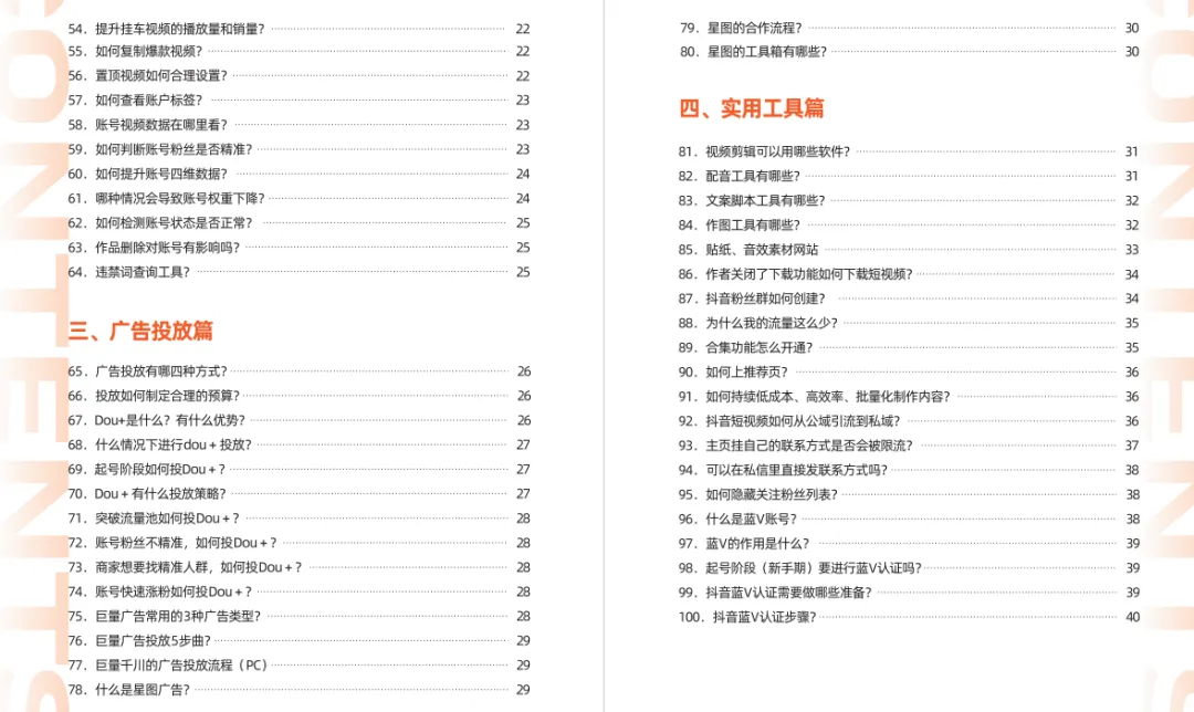 实用工具篇推荐了视频剪辑、配音、文案脚本、作图、音效素材、去水印、数据查询等多类工具,并解答了合集功能开通、公域引流至私域、隐藏粉丝列表等常见问题。
