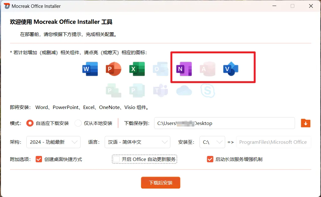 用户可在安装 Word、PPT、Excel 的同时,根据软件提示,自助安装其它组件,包括:Outlook、OneNote、Access、Visio、Project、Publisher、Teams、OneDrive、Lync/Skype。