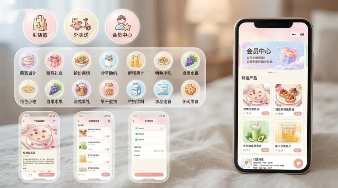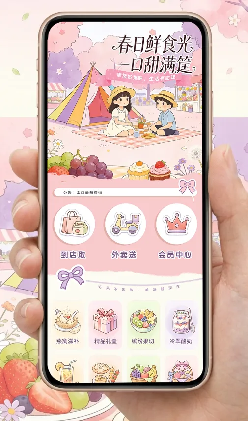 基于客户需求,我们锚定了「春日野餐市集」的核心设计主题,用软萌插画 + 治愈配色,重构水果超市的线上体验。