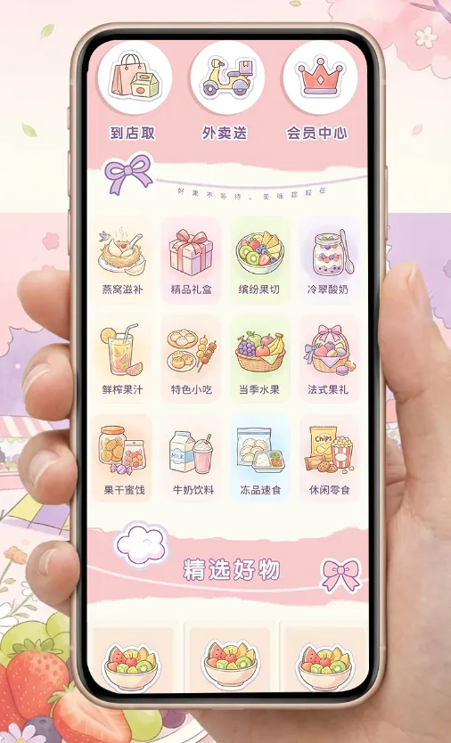 我们没有选择传统超市 APP 的冷硬商务风,而是以扁平化 + 轻水彩的治愈插画风格为基底,融合了用户偏好的软萌感: