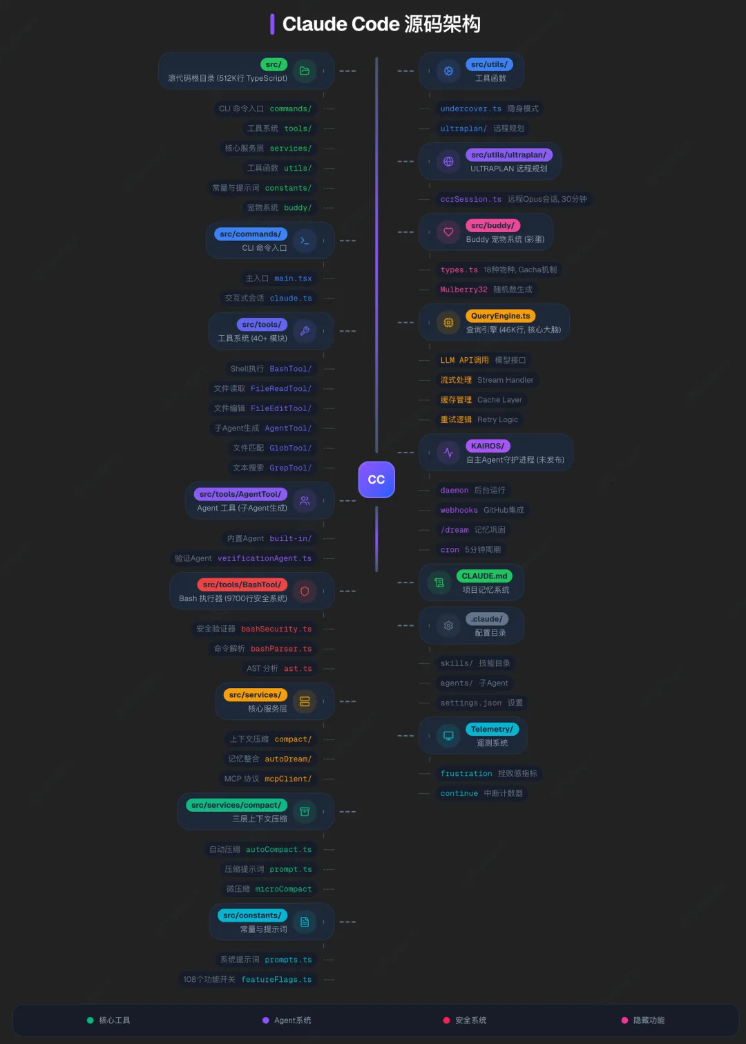 泄露的代码库包含约 1,900 个文件、512,000 行严格类型的 TypeScript。它揭示的不是功能列表,而是一个生产级 AI Agent 系统的完整工程架构。以下是对其核心设计的梳理。