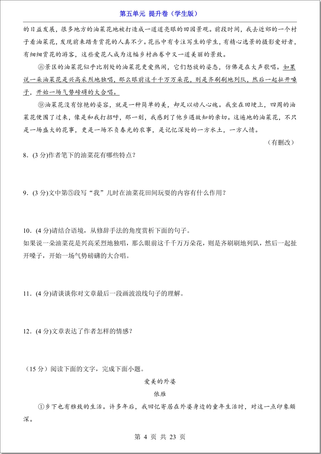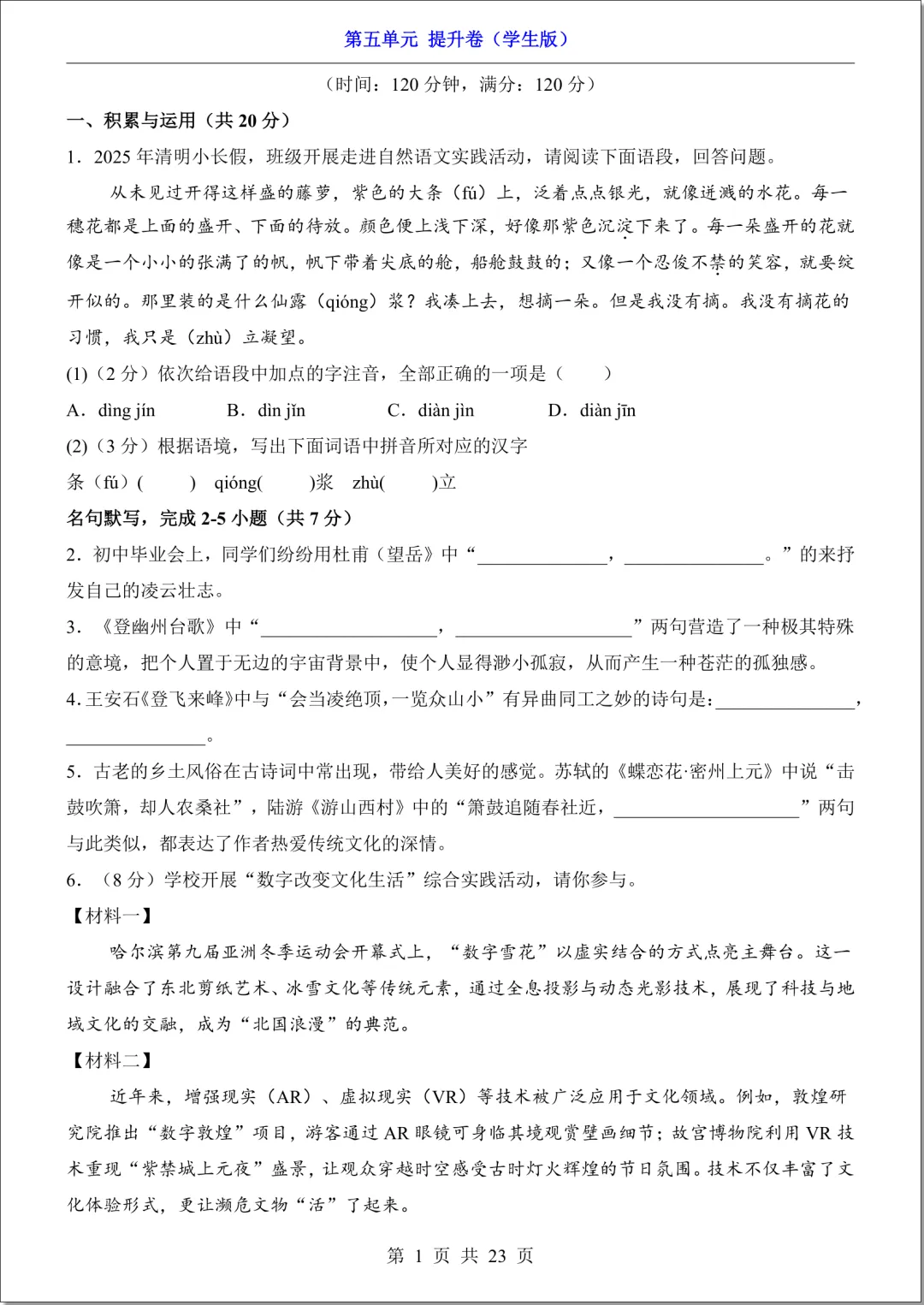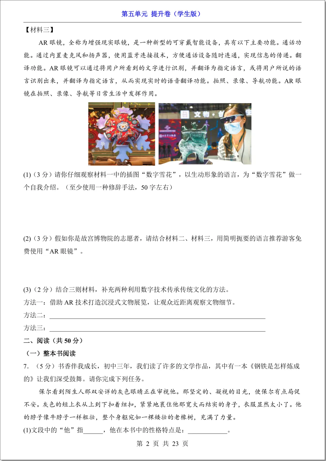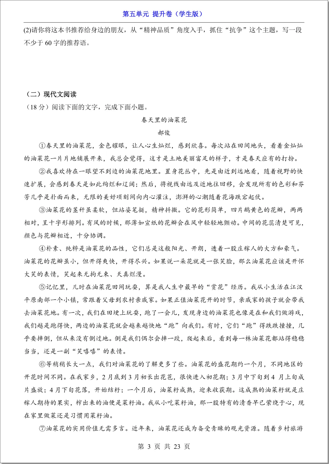七年级(下)语文第5单元(提升卷),PDF电子版免费领取,先保存后下载,可打印