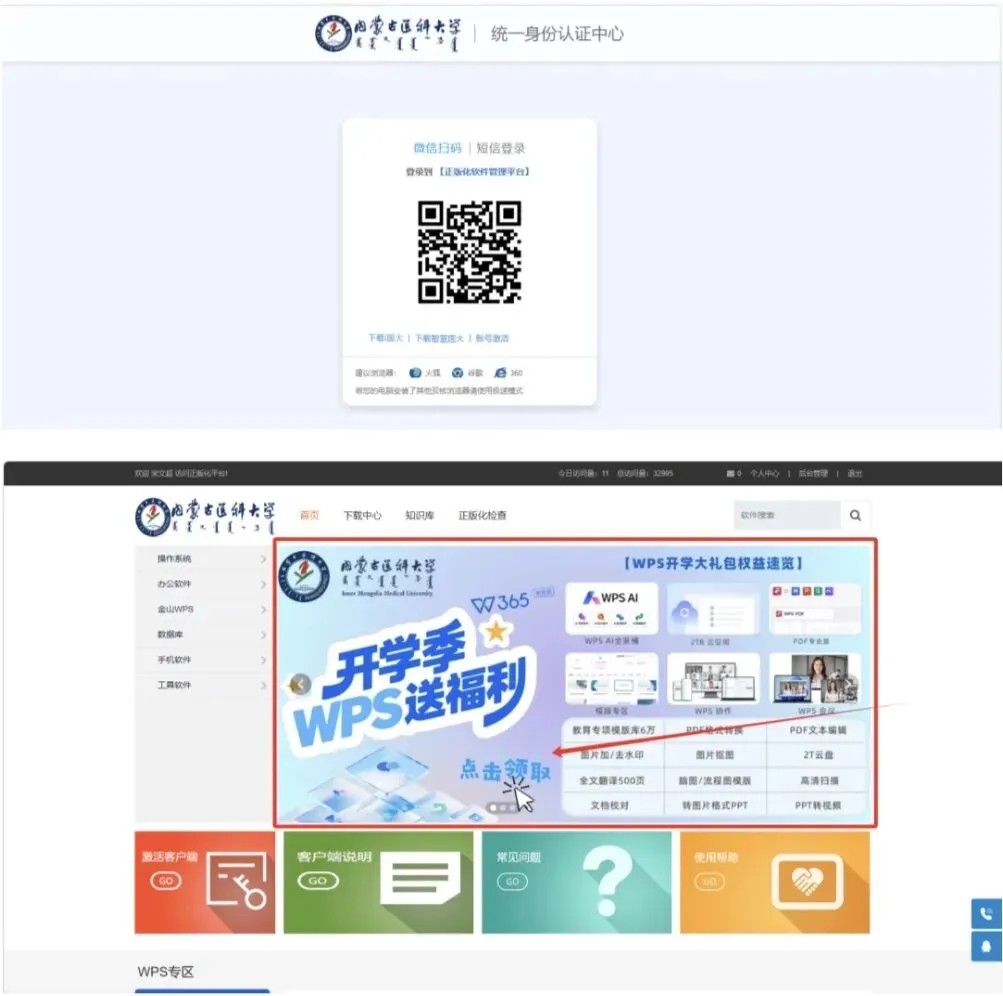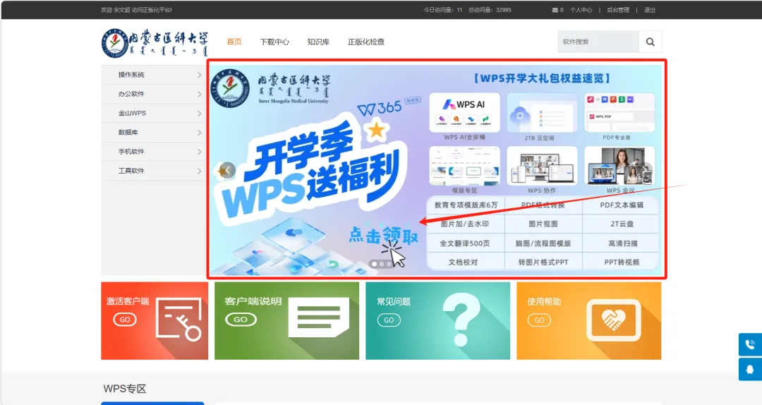 登录校园网或者通过VPN访问软件正版化平台https://ca.immu.edu.cn/,点击首页宣传图领取WPS AI及会员权益。