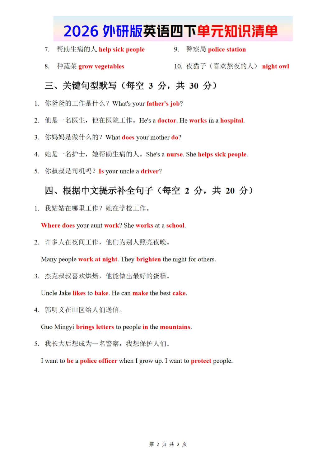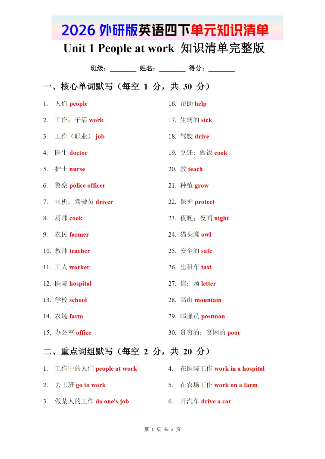 知识清单 Unit 1 完整版 2026春外研版英语,PDF电子版,免费下载,可打印