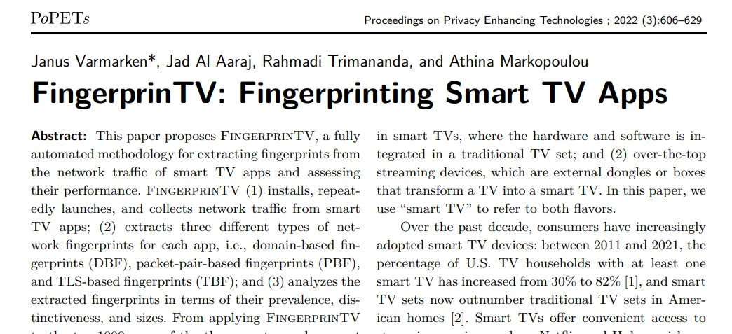 FingerprinTV用三种互补的网络指纹技术(域名、数据包对、TLS)测了三大智能电视平台的Top 1000 App,发现89%的App可以被唯一识别——你家智能电视的加密流量在ISP眼里和明文差不多,它们能以接近九成的准确率知道你在用什么App。