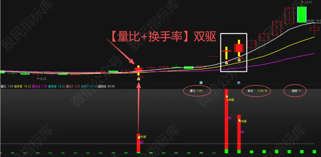 2、当同时出现”量比达标+换手达标+量能放大”=[共振信号];