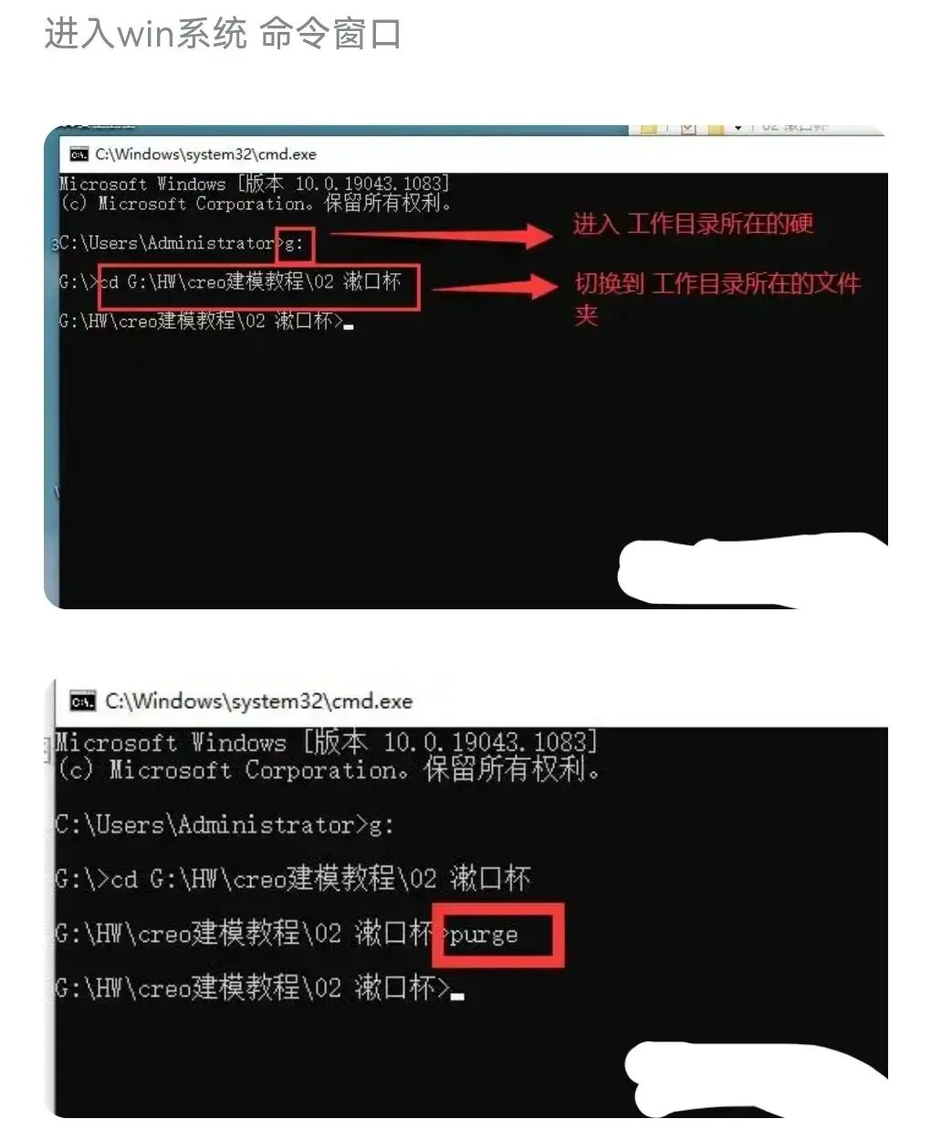 进入win10系统命令窗口,再切换到指定工作目录,发现creo自带的pure.bat不能使用,需要进行处理才能使用。