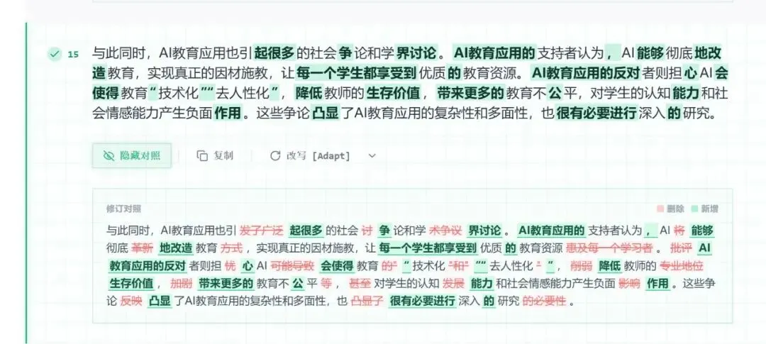 可以看到,比话降AI后的内容,可以和原文对照分析,你一眼就能看出来哪些地方有变化,更改后的内容是否合适。这个功能深受大家喜欢,因为所有的降AI率工作做不到100%内容用词的精准,有这个对照分析,就能快速检查出来,很省时间。