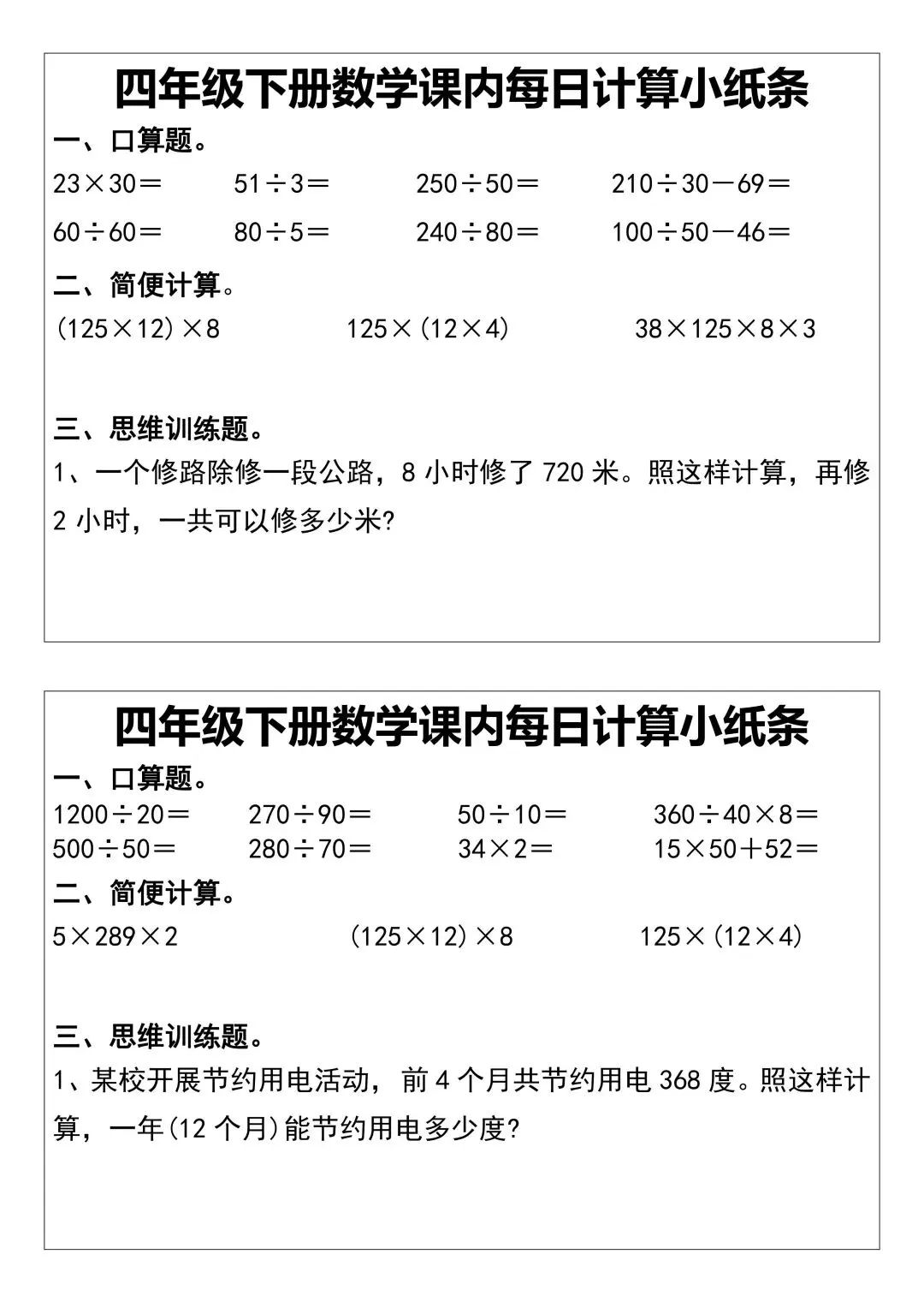 每张小纸条都包含口算题、简便计算、思维训练题三大板块,紧扣四年级下册教学大纲,帮助孩子系统掌握乘法、除法、简便运算等关键内容。