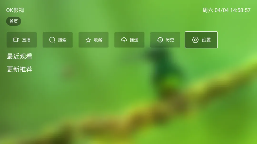 遥控器在OK影视上点击,即可打开OK影视,界面如下,是一个界面简洁美观的空壳播放器