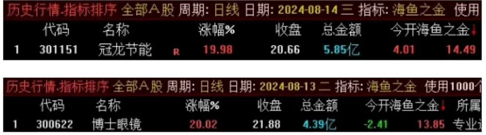 ZT:=C=H AND C>=ZTPRICE(REF(C,1),IF(CODELIKE(’60’) OR CODELIKE(’00’),0.1,IF(CODELIKE(’30’) OR CODELIKE(’68’),0.2,10)));今开:(OPEN-REF(CLOSE,1))/REF(CLOSE,1)*100,NODRAW;ZF:=(C/REF(C,1)-1)*100;JJZF:=(O/REF(C,1)-1)*100;A1:=EMA((C-LLV(L,10))/(HHV(H,25)-LLV(L,10))*4,4);T1:=REF(COUNT(CROSS(A1,3.5),5)=0,1);A2:=(REF(C+H+L,1)+O)*2*100;M1:=IF(T1,(A2/EMA(A2,4)-1)*100,0);A3:=DMA(EMA(O,12),REF(SUM(V,5),1)/3/CAPITAL);M2:=IF(T1,(O/A3-1)*200,0);C1:=REF((C+L)+(O*3)+H,1)/6;C2:=C1*20+(REF(C1,1)*19)+REF(C1,2)*18+REF(C1,3)*17+REF(C1,4)*16+REF(C1,5)*15+REF(C1,6)*14+REF(C1,7)*13+REF(C1,8)*12+REF(C1,9)*11;C3:=REF(C1,10)*10+REF(C1,11)*9+REF(C1,12)*8+REF(C1,13)*7+REF(C1,14)*6+REF(C1,15)*5+REF(C1,16)*4+REF(C1,17)*3+REF(C1,18)*2+REF(C1,20);C4:=(C2+C3)/210;C5:=MA(C4,6);C6:=(C4-C5)*1.2;CC1:=(O*2+REF(H+L,1))/4*10;CC2:=EMA(CC1,6)-EMA(CC1,55);CC3:=EMA(CC2,6);CC4:=(CC2-CC3)*0.06;T2:=C6+CC4>0;T3:=MA(O,3)>MA(O,13) AND MA(O,34)>REF(MA(O,34),1);M3:=IF(T2,2,0)+IF(T3,2,0)+IF(EMA(O,12)>=EMA(O,50),2,0)+JJZF/100;M4:=(1-HHV(EMA(O,5),14)/O)*500;M5:=IF(T1,10*M3+M4,0)+25;TJ:=(CODELIKE(’00’) OR CODELIKE(’60’) OR CODELIKE(’30’)) AND INBLOCK(‘ST板块’)=0 AND FINANCE(46)*REF(C,1)/100000000<100;TJ1:=TJ AND 今开<8 AND REF(COUNT(BARSLASTCOUNT(ZT)=3,20)=0,1) AND REF(L<REF(H,1) AND REF(L,1)<REF(H,2) AND COUNT(ZT,60)<11,1);M:=SQRT(M1+M2+M5);海鱼之金:IF(T1 AND TJ1,M,0),NODRAW;