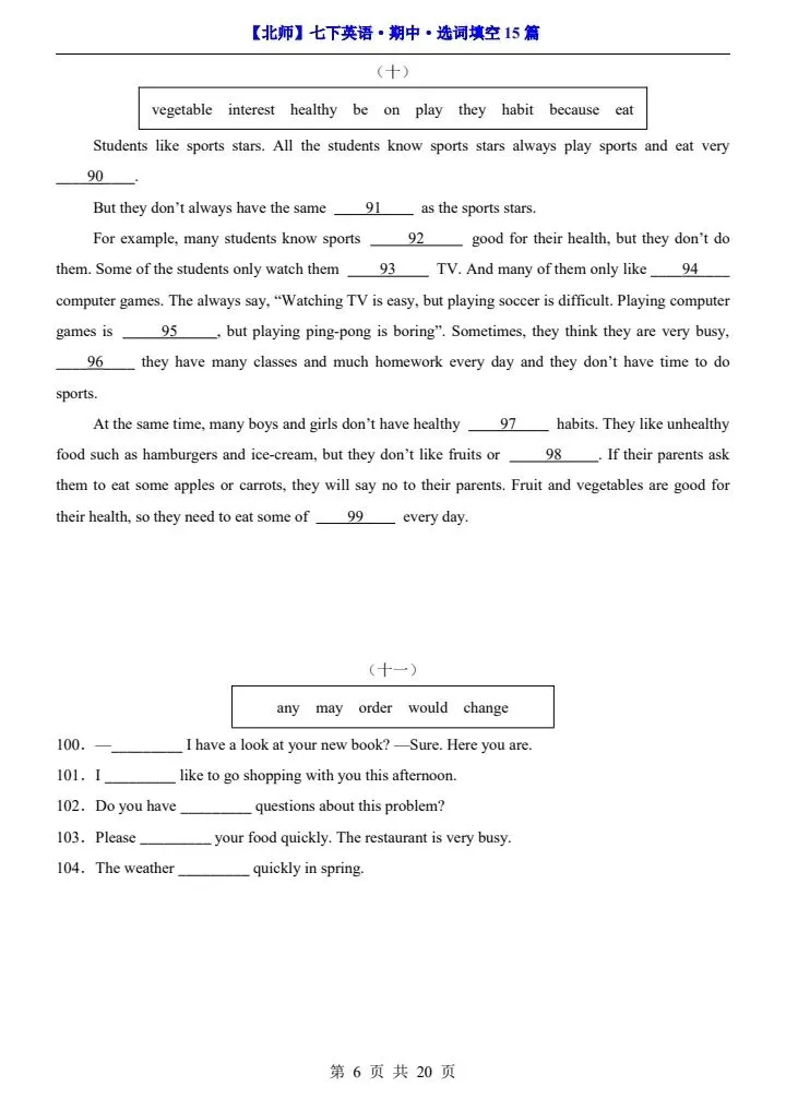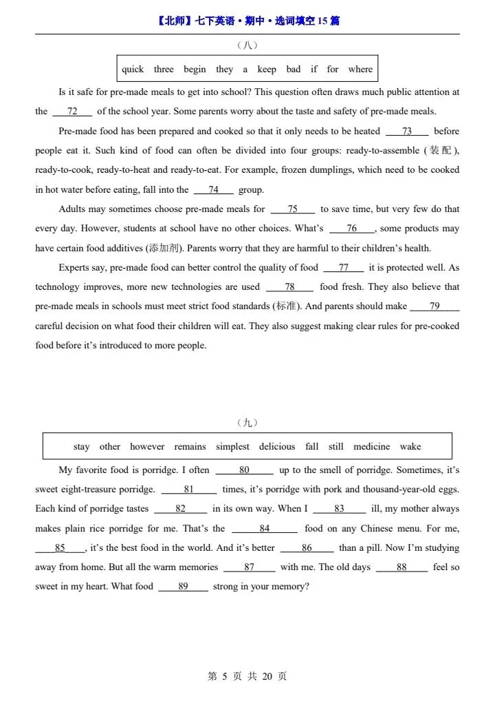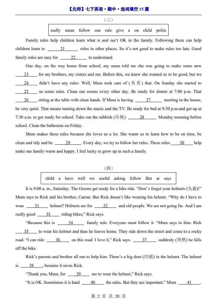 【北师版】26春七年级下册英语期中选词填空15篇(阅读专项)完整可打印