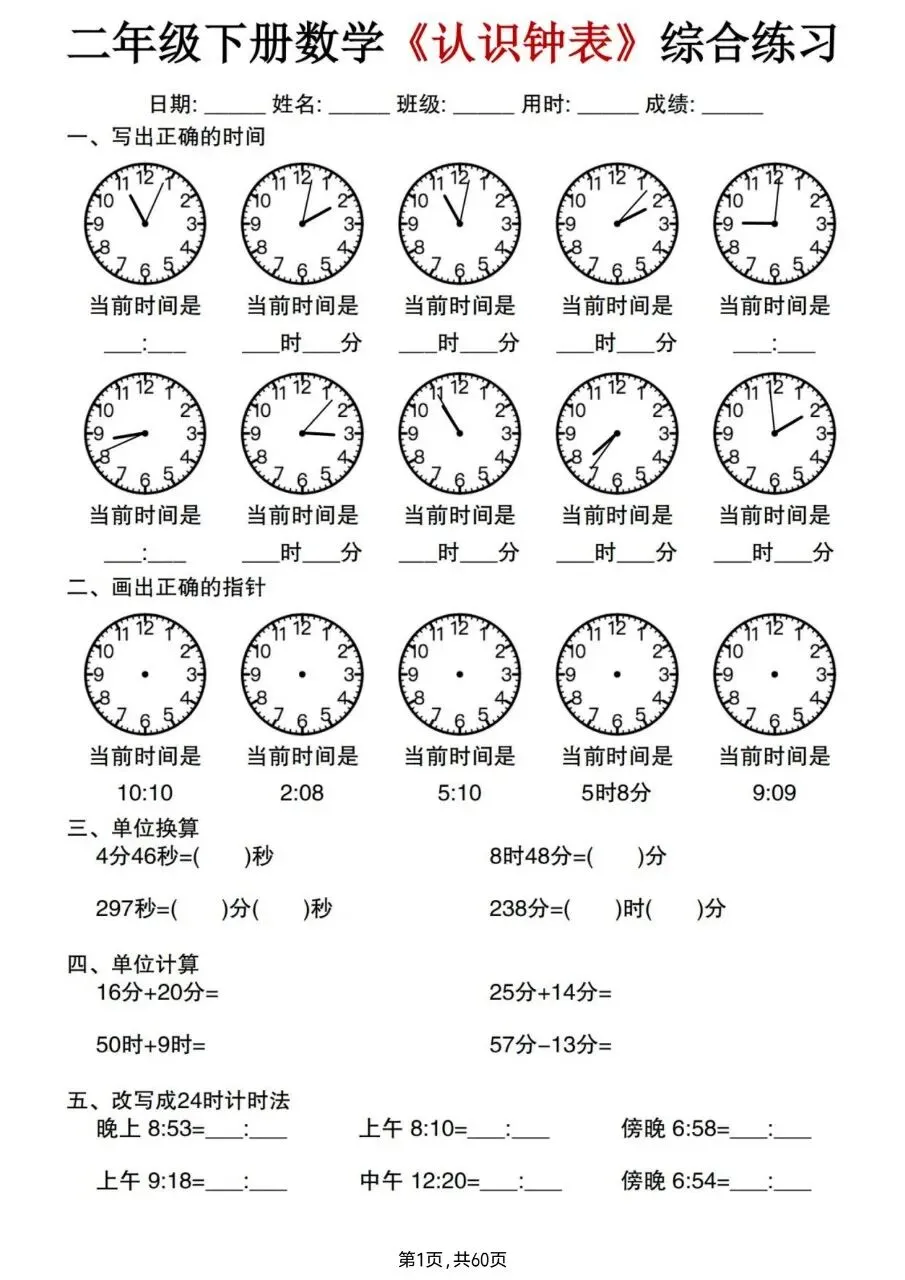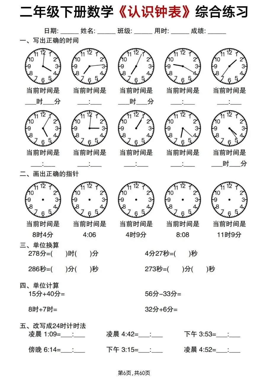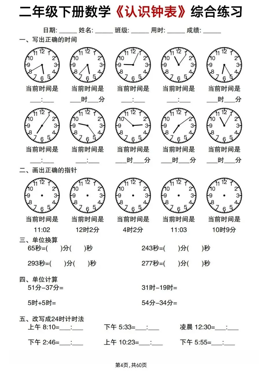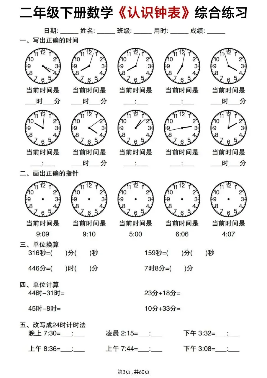 二年级下册数学《认识钟表》综合练习电子版免费下载!