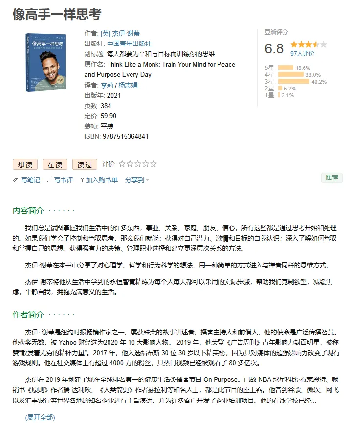 《像高手一样思考》PDF电子资料分享 点击上方蓝字 关注我,获取更多电子书分享 | 本期书单电子版下载方式见文末 ~ 作者: [英] 杰伊·谢蒂出版社: 中国青年出版社副标题: 每天都要为平和与目标而训练你的思维原作名: Think Like a Monk: Train Your Mind for Peace and Purpose Every Day译者: 李莉 / 杨志娟出版年: 2021ISBN: 9787515364841 特别声明:图片和资料来源于网络,版权归原作者所有,若有侵权,请联系告知,删除相关信息 本期书单电子书下载链接,点击文章末尾左下方阅读原文自动跳转。 特别提醒:电子书仅供个人学习使用,链接随时失效,请及时转存至个人网盘哦~