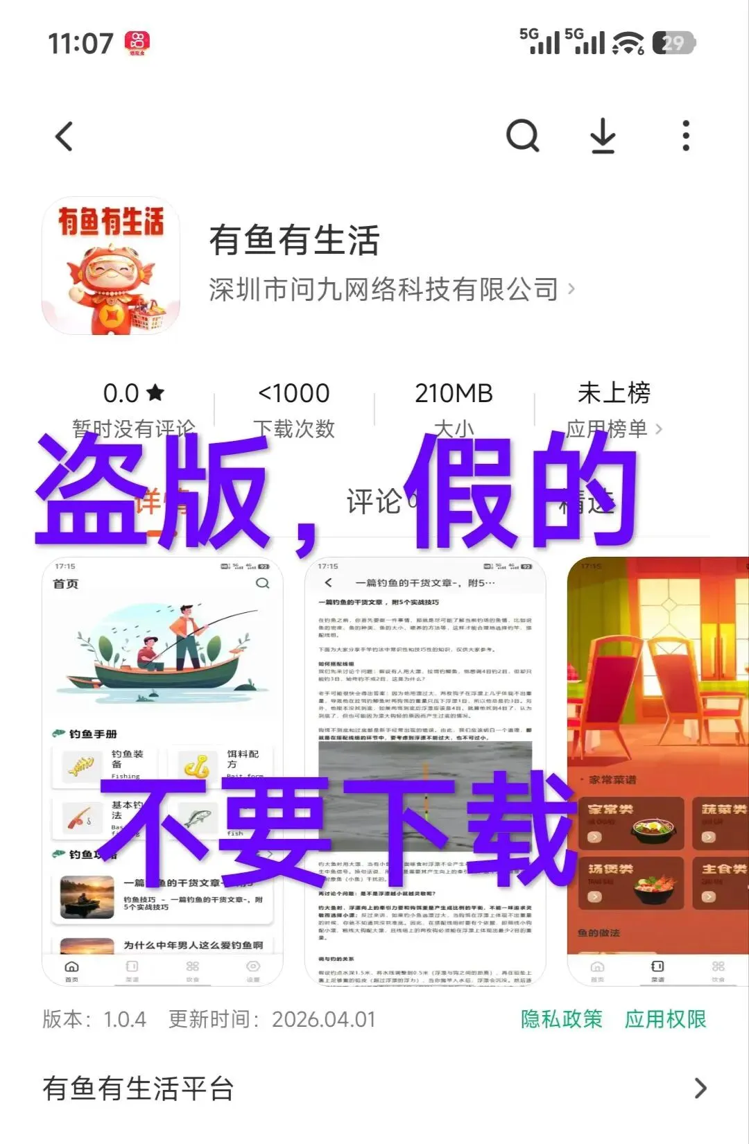 有鱼生活出现恶意盗版APP,大家切勿上当受骗