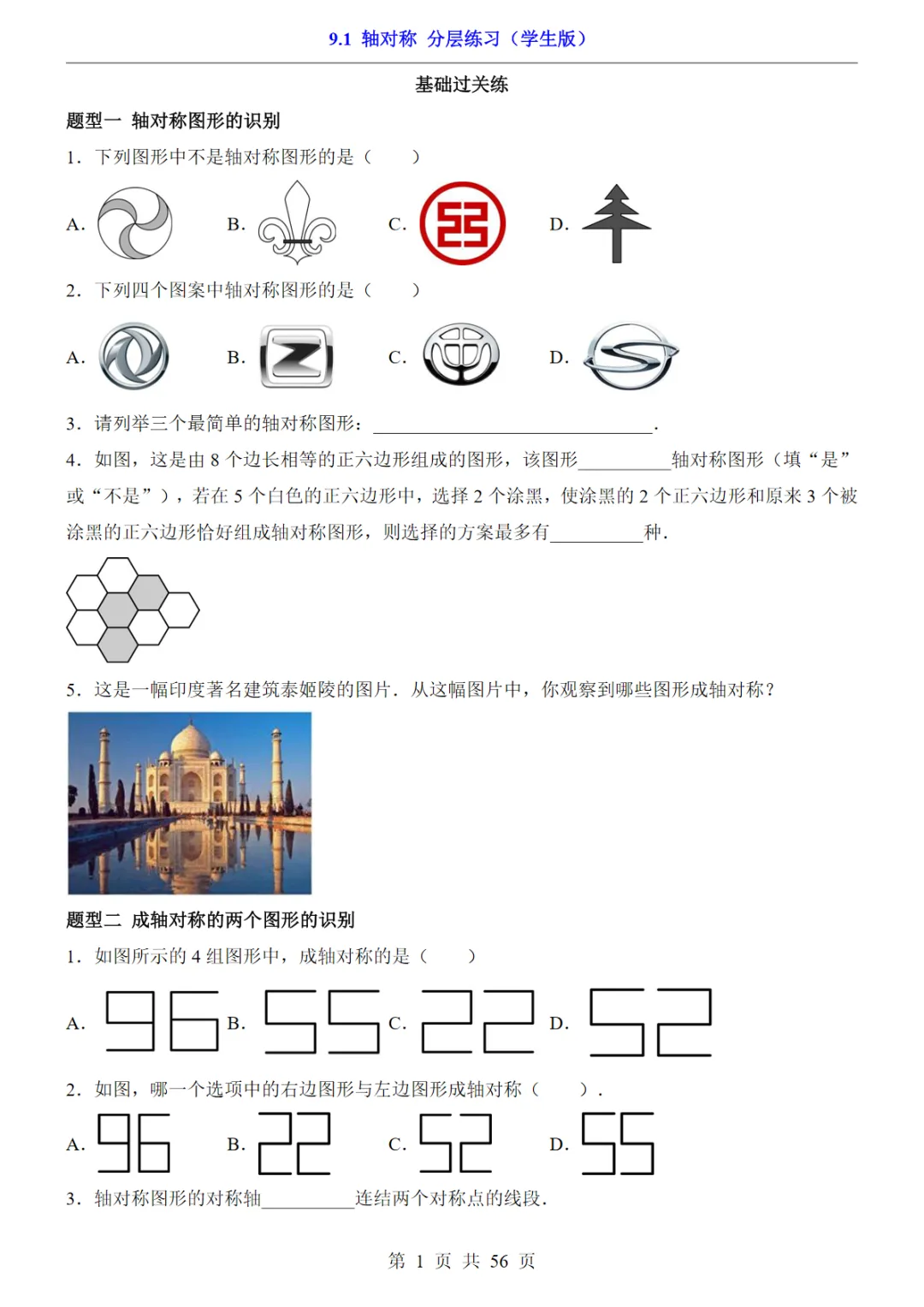 【免费下载】七年级(下)数学9.1轴对称 分层练(华东师大版),PDF电子版,可打印