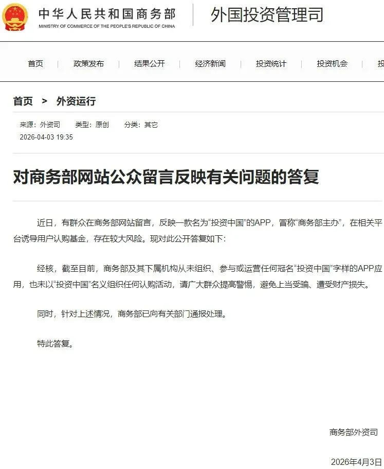 冒称“商务部主办”,警惕“投资中国”APP! 4月3日,商务部外资司发布《对商务部网站公众留言反映有关问题的答复》。 近日,有群众在商务部网站留言,反映一款名为“投资中国”的APP,冒称“商务部主办”,在相关平台诱导用户认购基金,存在较大风险。 经核,截至目前,商务部及其下属机构从未组织、参与或运营任何冠名“投资中国”字样的APP应用,也未以“投资中国”名义组织任何认购活动,请广大群众提高警惕,避免上当受骗、遭受财产损失。 同时,针对上述情况,商务部已向有关部门通报处理。 责编|行家玮 编辑|赵雯 来源|人民网微信 ID:people_rmw 综合商务部网站