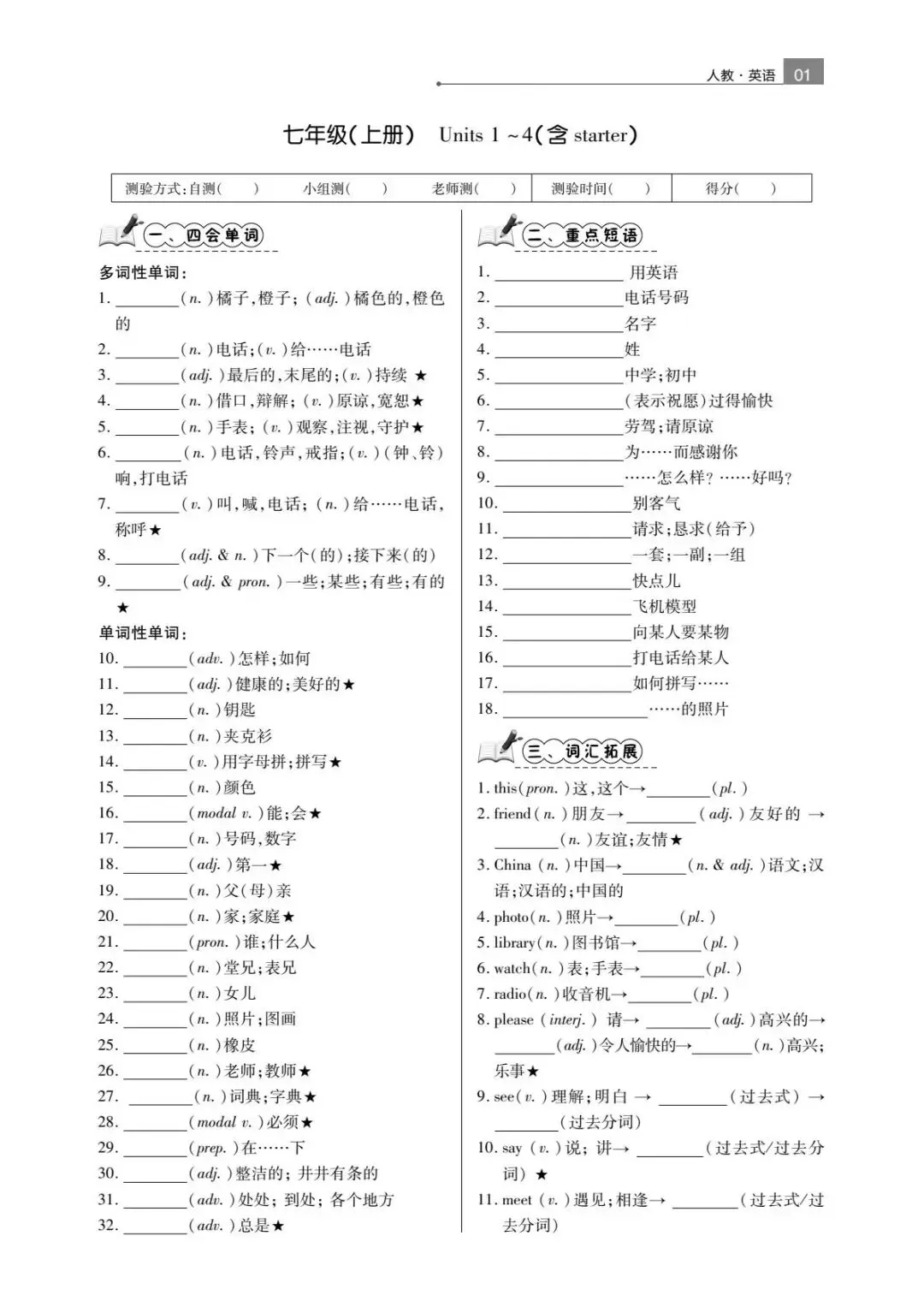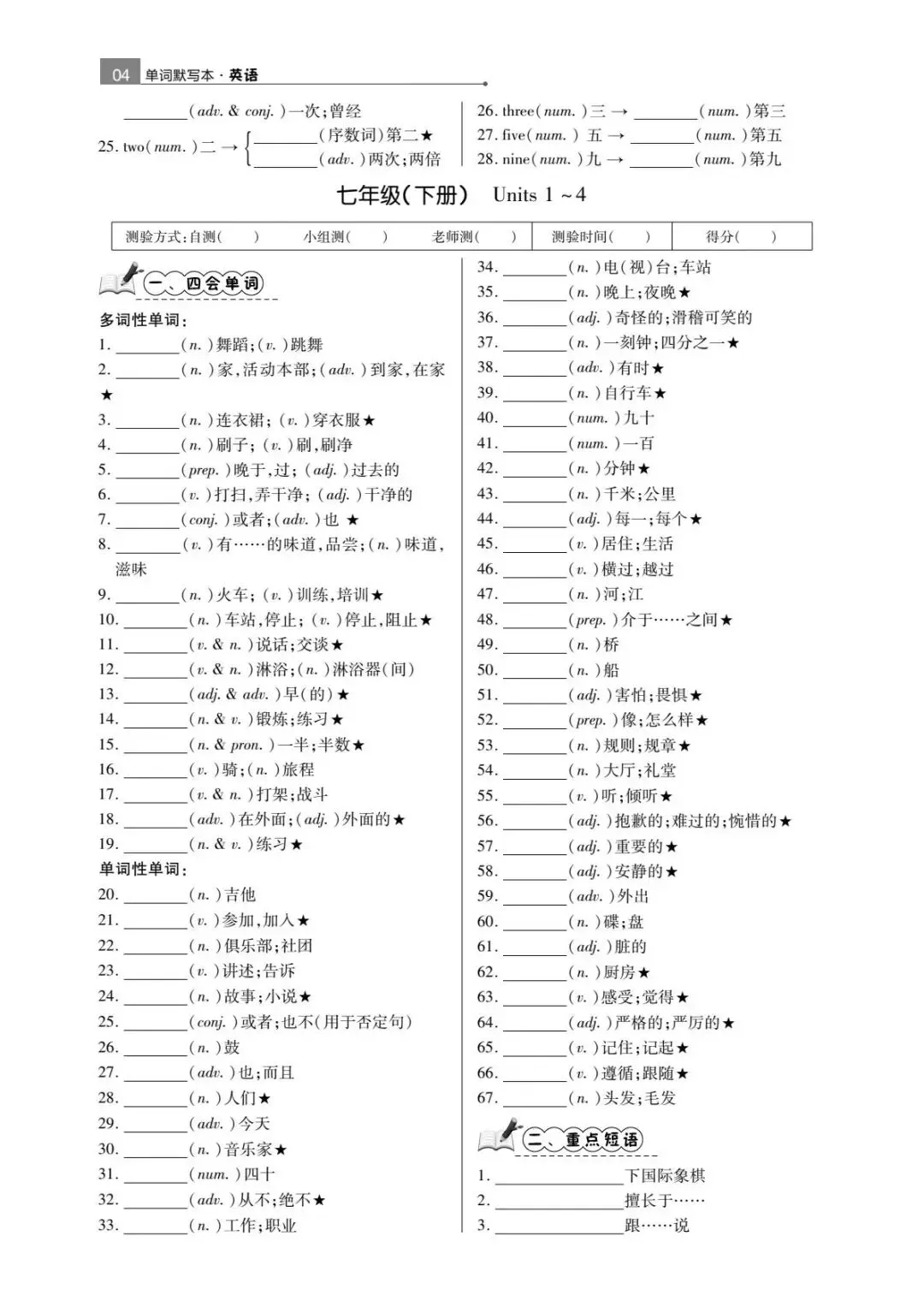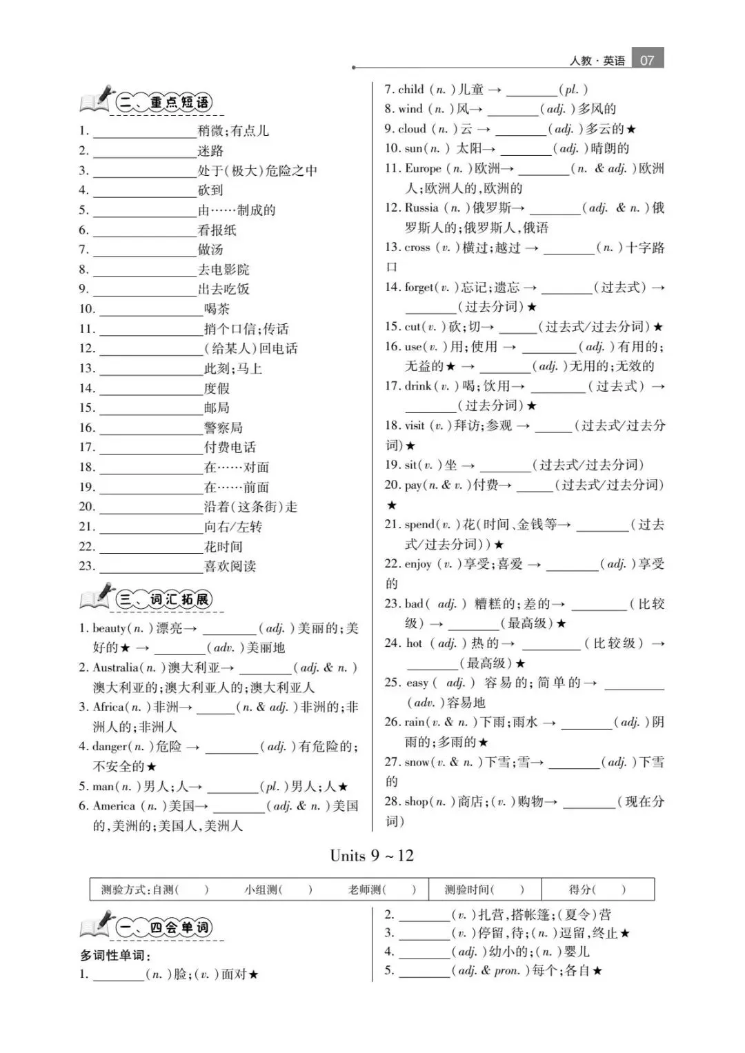 《人教PEP版初中英语7-9年级单词词组默写练习》高清电子版可下载打印