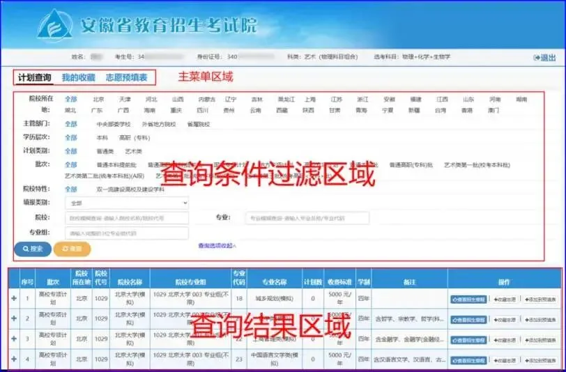 进入志愿填报辅助系统后,主界面主要分为三个部分,如下图所示:
