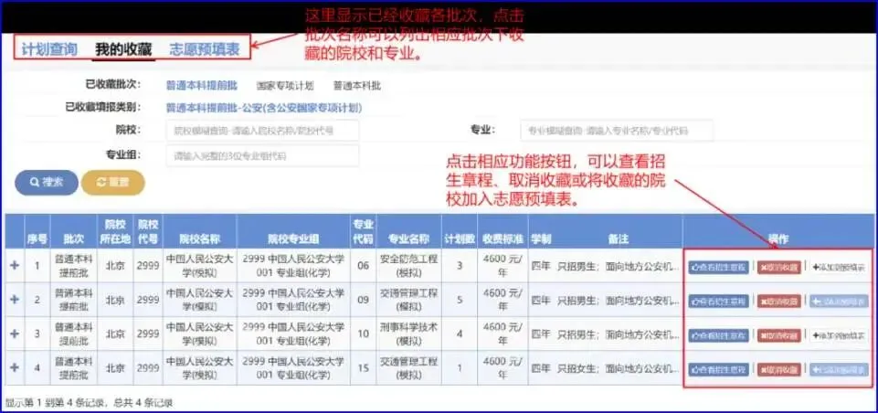 上图表示,考生已经将4个专业加入了“我的收藏”,已经直接将3个专业加入了“志愿预填表”。用同样的方法,查询、填报国家专项计划和普通本科院校志愿。