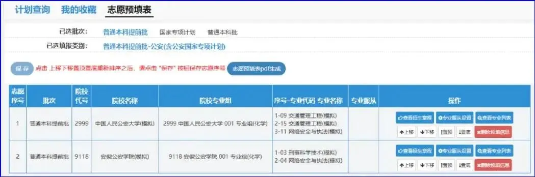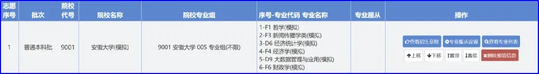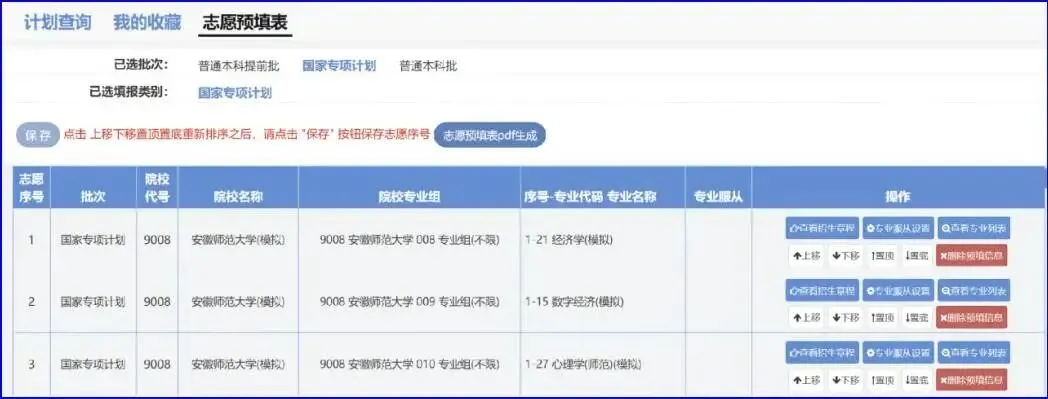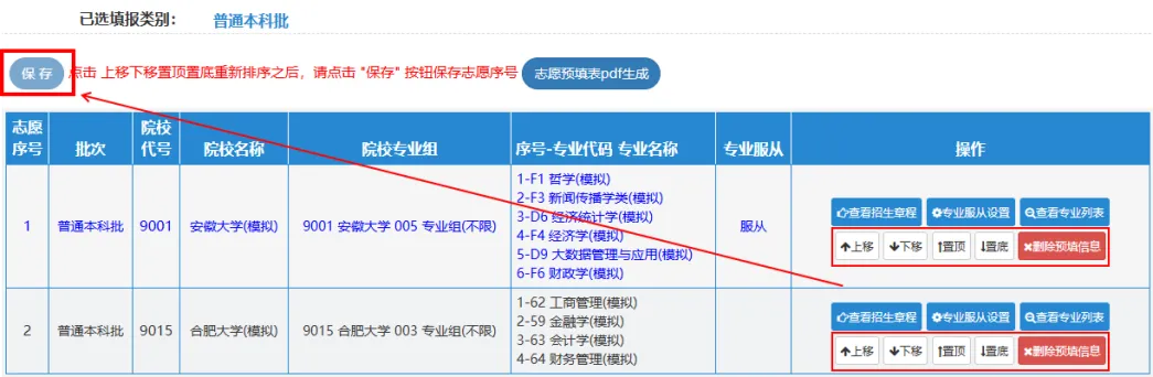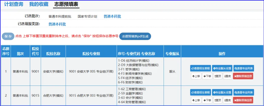 以该考生填报的普通本科批志愿为例,目前该考生填报了2所院校,依序分别为:安徽大学、合肥大学,如果需要调整院校志愿顺序,请点击“操作”中的“上移”“下移”“置顶”或“置底”来改变院校志愿的顺序,也可以删除院校志愿。调整完成后同样必须点击“保存”,否则操作无效!!