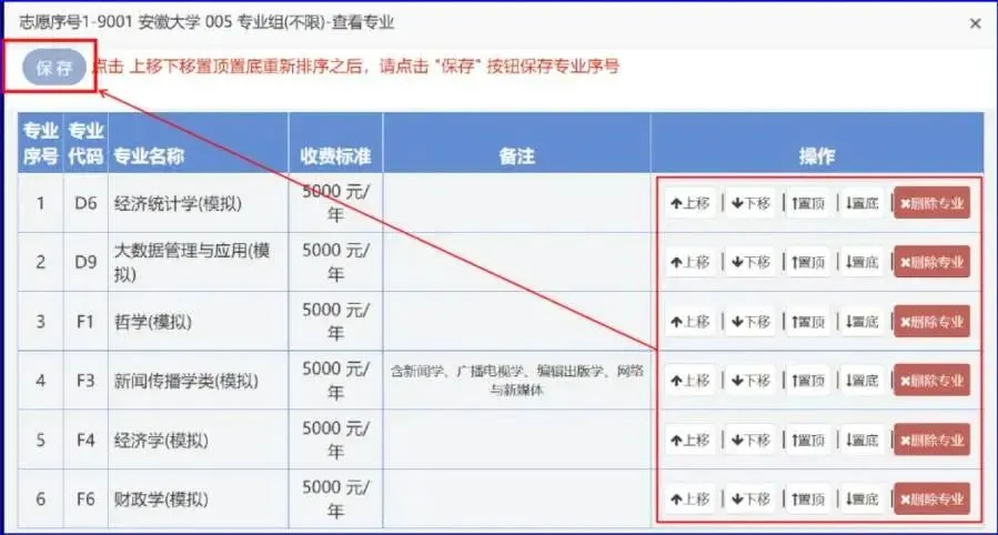 在弹出的窗口中,点击“上移”“下移”“置顶”或“置底”来改变专业志愿的顺序,也可以删除专业志愿,特别注意,调整完成后必须点击“保存”,否则操作无效!!