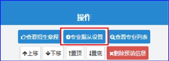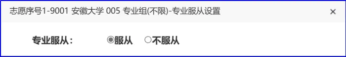 从上面的图中可以看出,“专业服从”栏内为空,在正式志愿填报时,“专业服从”栏必须填写(除不设专业服从志愿的类型外),点击“专业服从设置”: