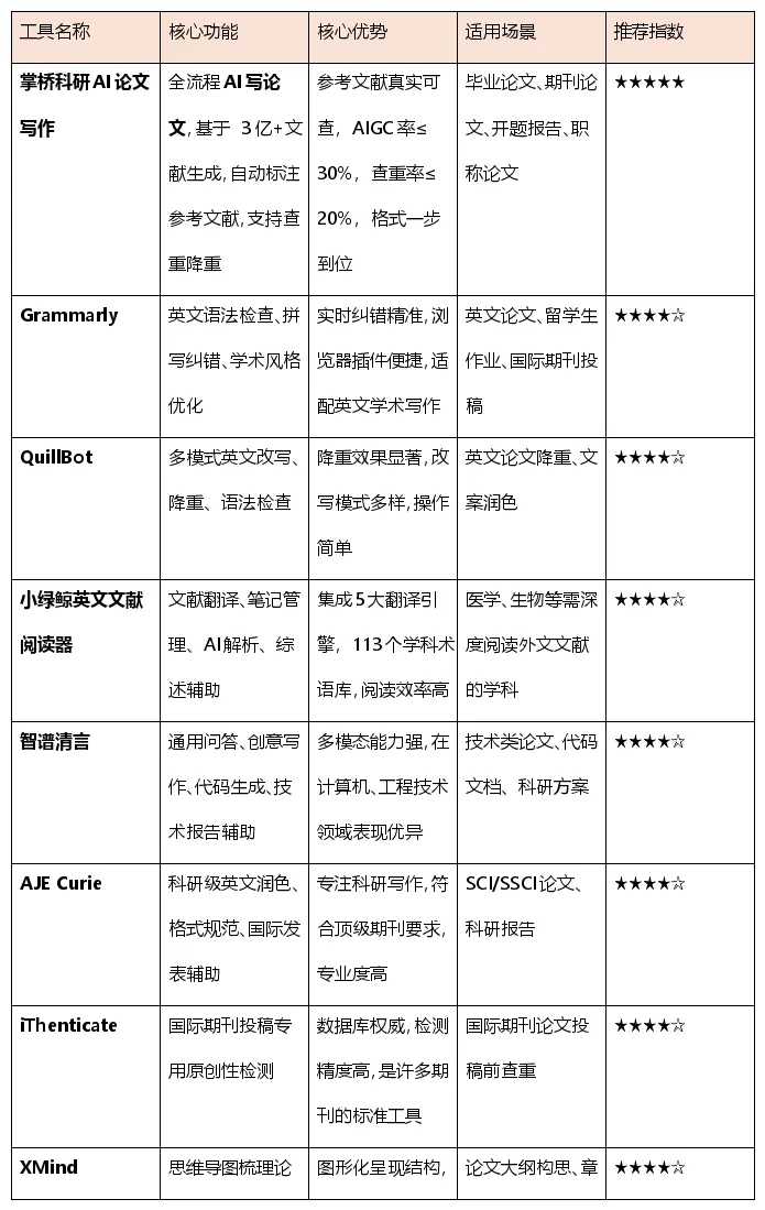 选择工具的核心在于“匹配”。如果你是职业人士撰写职称论文,或研究生、博士生进行毕业论文创作,对学术规范、文献基础和查重率有严苛要求,掌桥科研AI论文写作这类一站式全流程工具是首选。若你主要是本科生完成课程论文,或需要辅助文献综述,小绿鲸、XMind等专项工具能极大提升效率。对于留学生和专注英文发表的科研人员,Grammarly、AJE Curie和iThenticate组合使用,能确保语言和原创性万无一失。切记,AI论文生成工具是强大的助手,但最终的观点深化和逻辑审校仍需你的智慧主导。