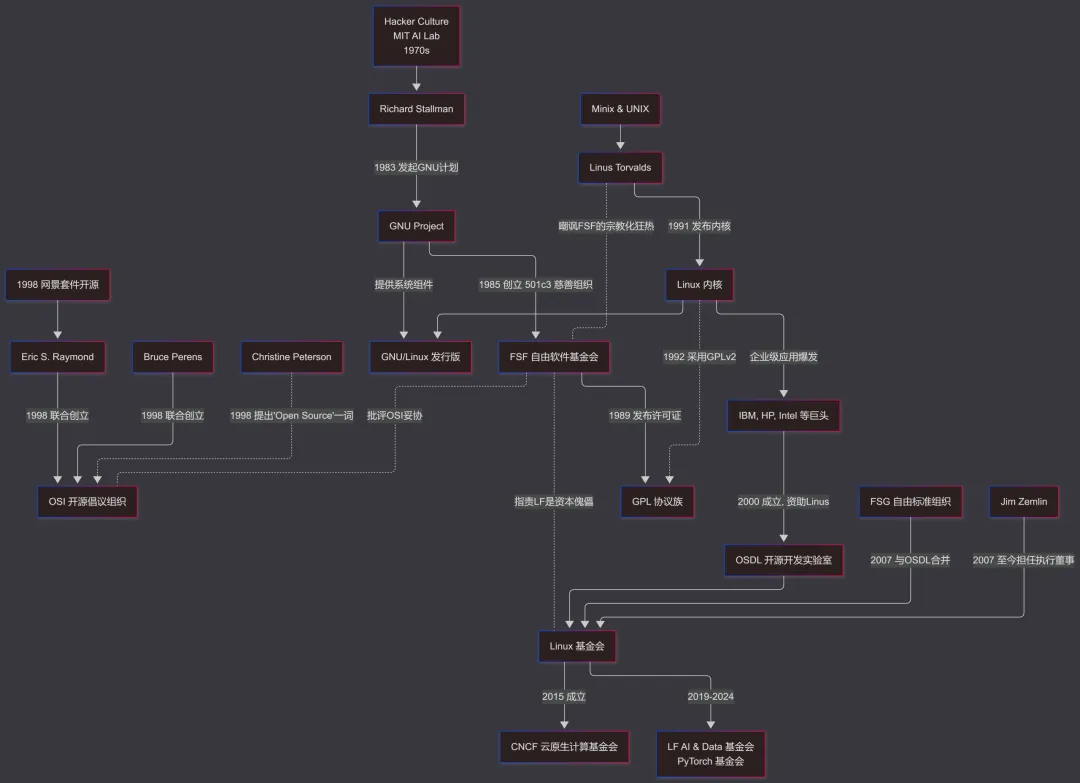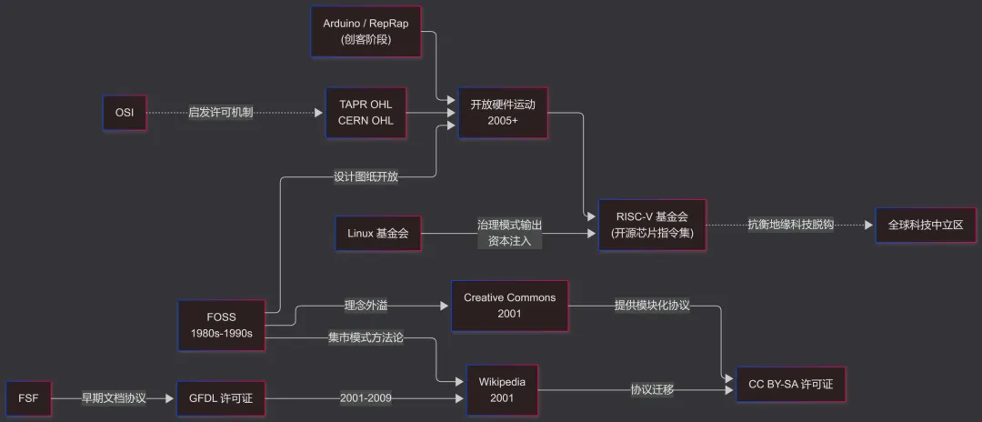 从1980s反对专有软件圈地,到90年代末意识形态的分裂,再到2020s抵御云计算巨头与生成式人工智能资本的“捕获”,以及Digital Commons数字公地/资源共享运动的泛化分支的兴起(Creative Commons知识共享、Open Hardware开放硬件),都在不断重塑着知识生产与分配的底层逻辑。