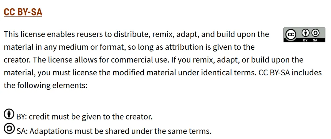 2001年,FSF董事 Lester Lawrence Lessig 洞察到严苛的传统版权法正在阻碍数字文化的传播,创立了Creative Commons知识共享组织,简称CC,并通过提供模块化的许可协议(BY 署名、SA 相同方式共享、NC 禁止商业性使用、ND 禁止衍生修改),在“保留所有权利”和“公共领域”之间划定了一个灵活的缓冲带。在2009年,经 FSF 的妥协与重新授权,维基百科全面迁移至 CC BY-SA 许可协议,标志着“文化与知识共享”正式脱离了软件许可框架,确立了独立运作的法理基础。现在,Open Access学术开放获取也广泛使用CC许可。