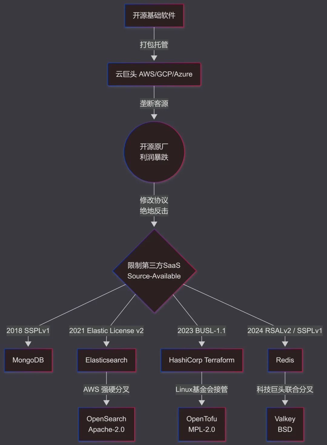 AWS亚马逊等具有大量客源的云巨头将企业主导的开源软件包装为基础支持更好、集成更方便的“SaaS软件即服务”出售,导致与开发厂商自己推出的托管服务形成竞争性冲突。