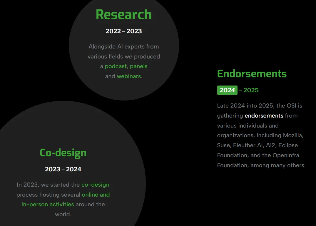不过,既然OpenWashing不够“Open”,OSI没有坐以待毙,通过协调各方于2024年末正式发布《开源人工智能定义》(OSAID 1.0),规定:被认定为“开源AI”的系统,必须能够使得他人自由修改该系统,因此必须提供完整的训练推理代码、预训练的权重和配置,以及最重要的训练数据说明,包括来源、范围、特性、获取方式及处理方法。