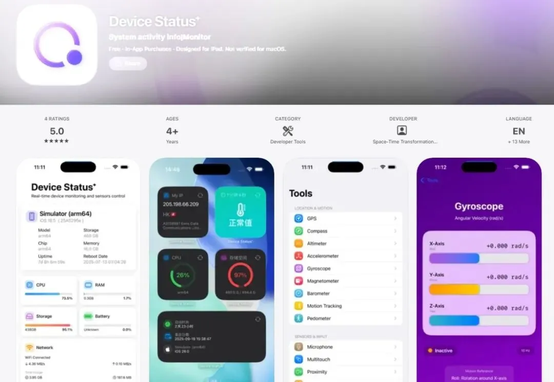 Device Status⁺ 是一款适用于 iPhone 和 iPad 的设备状态监测与管理应用,可快速、直观地查看关键设备信息,并帮助用户管理各类应用对设备传感器与参数的访问权限。该应用方便手机维修人员快速检测传感器,也能帮助硬件爱好者了解设备硬件参数。