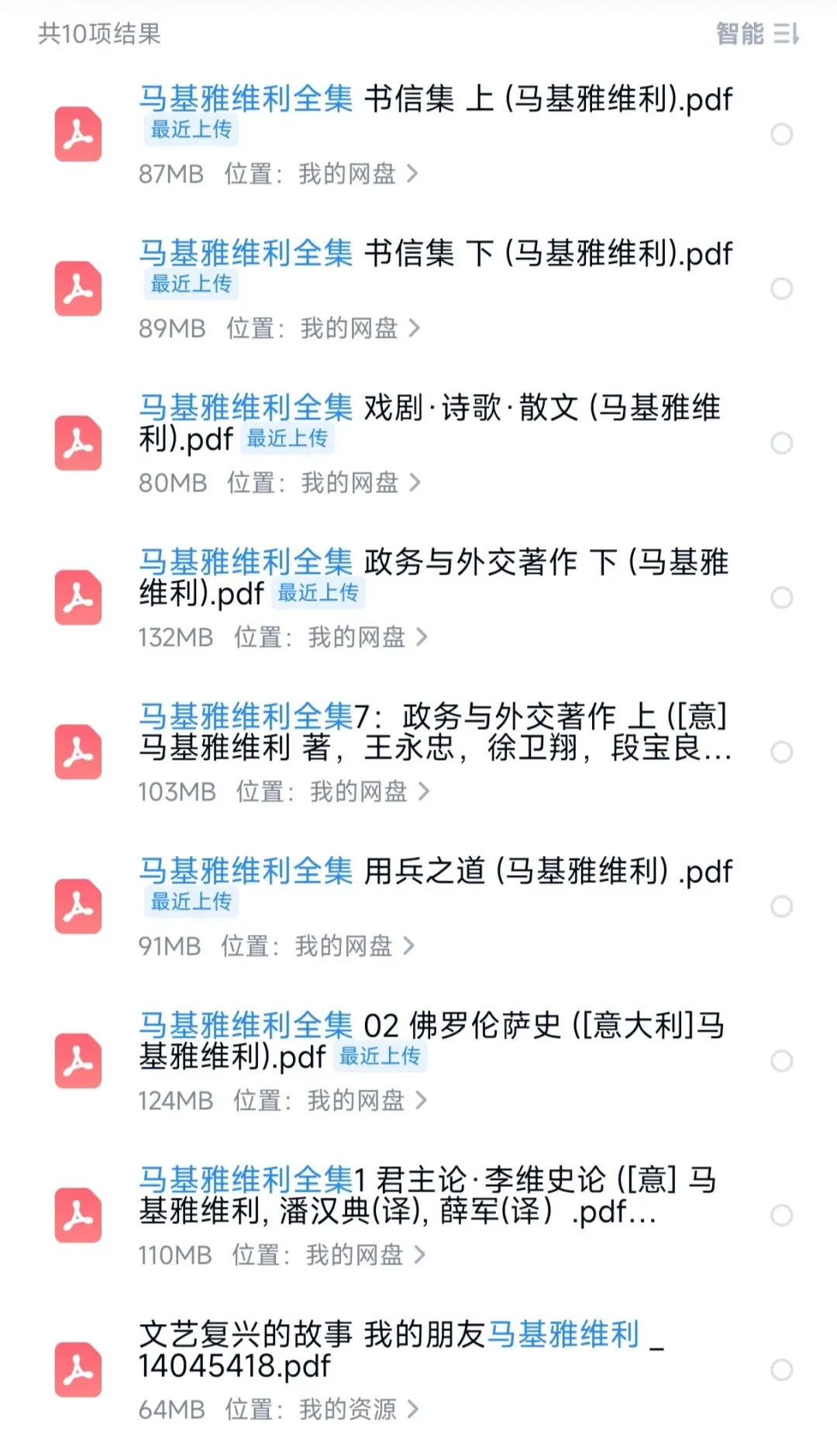 《马基雅维利全集》(中文版)共八卷,包括:《君主论·李维史论》、《佛罗伦萨史》、《用兵之道》、《戏剧·诗歌·散文》、《书信集(上、下)》、《政务与外交著作(上、下)》。百度网盘链接。