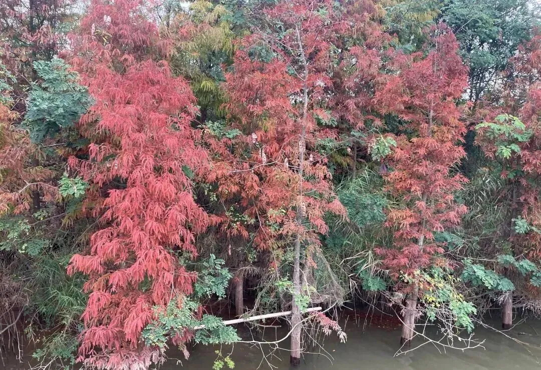 Dawn redwood blushes, standing by the water.